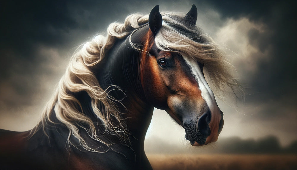 Ce papier peint portrait de cheval capture l'essence noble d'un magnifique étalon avec un détail saisissant. Le contraste dramatique entre le pelage brun foncé et la crinière blonde fluide crée un point focal hypnotisant, tandis que le regard réfléchi et la posture fière transmettent un sentiment d'esprit indompté. La fresque murale équestre est magistralement rendue sur un ciel sombre, avec un éclairage subtil qui met en valeur la forme musclée du cheval et sa présence éthérée.