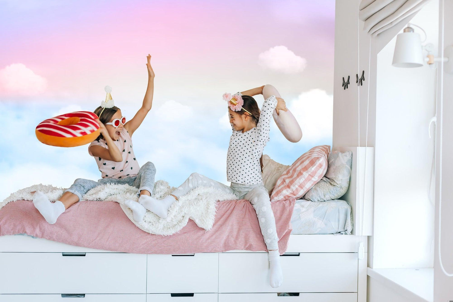 Le doux motif de nuages roses et bleus aide à créer votre coin tranquille parfait.