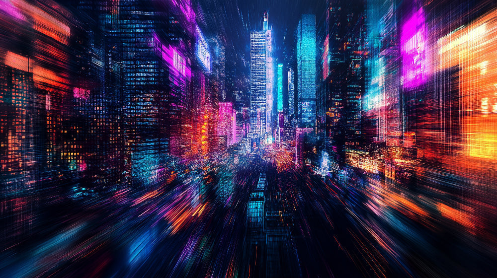 Ce papier peint de ville moderne capture le pouls électrisant d'une métropole urbaine en mouvement. La composition dynamique crée un effet hypnotisant à la vitesse de la lumière, où les gratte-ciel imposants se transforment en traînées de néons vibrants bleus, magentas et oranges chauds. Le papier peint abstrait de paysage urbain présente un point focal central de bâtiments illuminés perçant le ciel nocturne, leurs surfaces reflétant et réfractant une gamme de couleurs lumineuses.