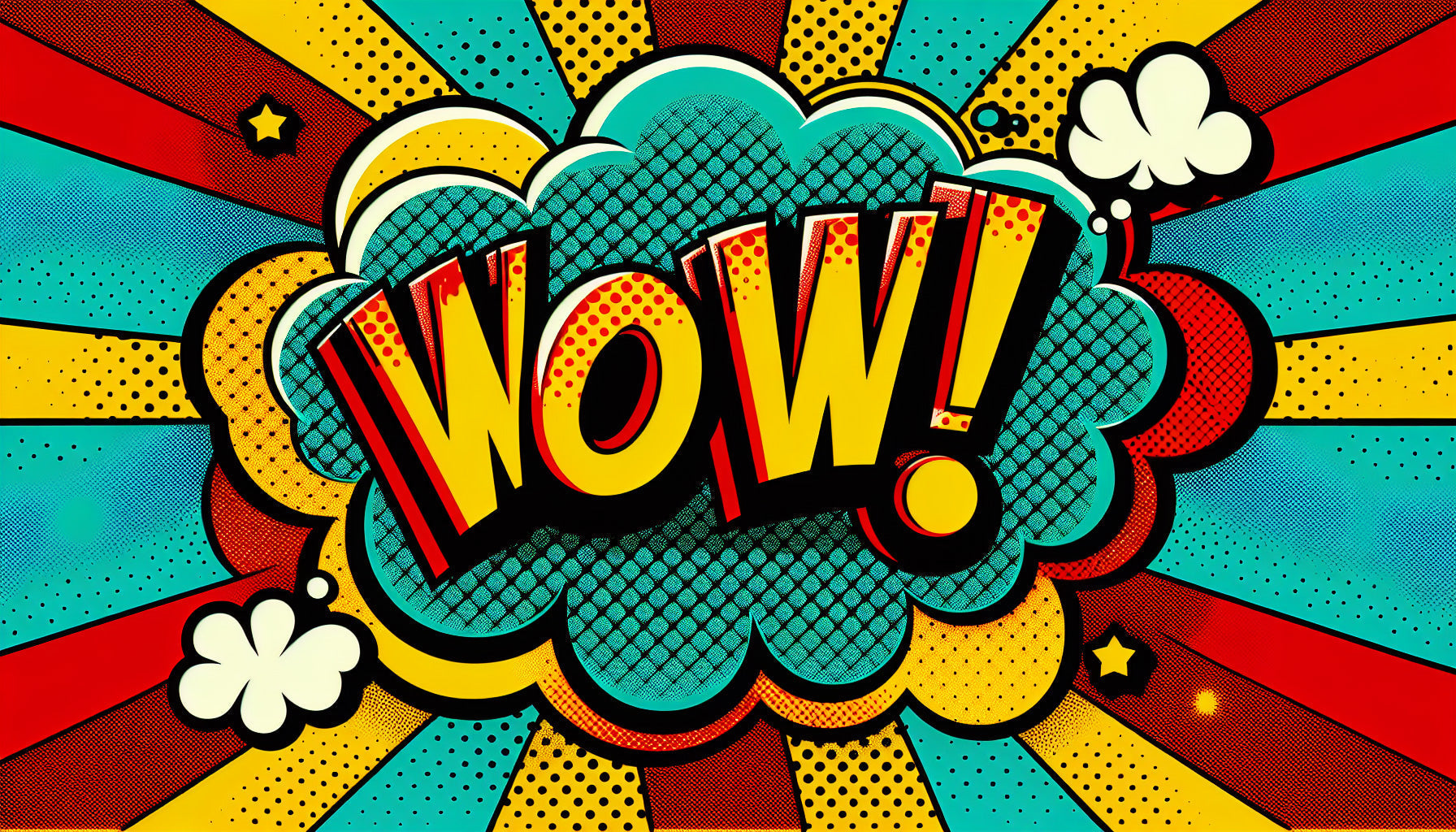 Ce papier peint bande dessinée déborde d'énergie dynamique grâce à sa composition pop art saisissante. Le lettrage audacieux « WOW » émerge d'un nuage turquoise sur un fond rayé jaune et rouge rayonnant. Des éléments classiques de bande dessinée comme les points demi-teinte, les bulles de pensée blanches et les étoiles dorées créent un papier peint pop art rétro authentique qui capture l'âge d'or des comics avec des détails vibrants.
