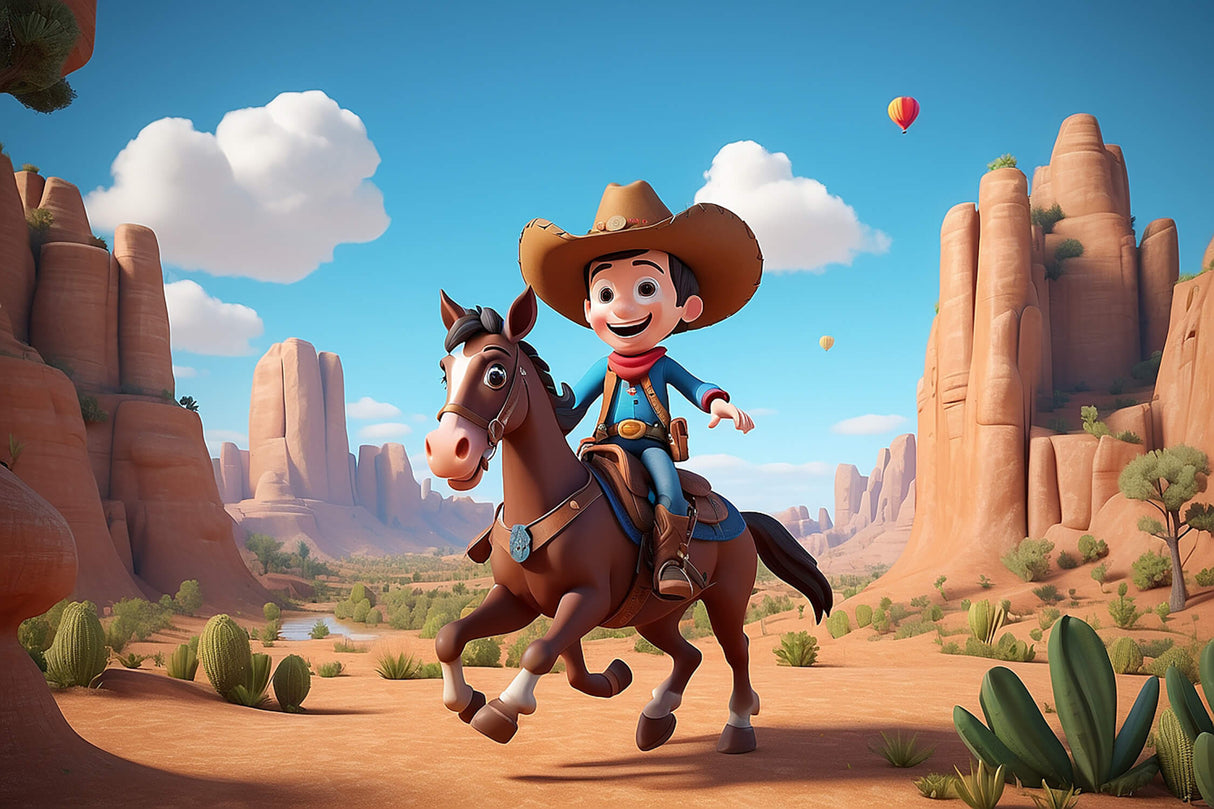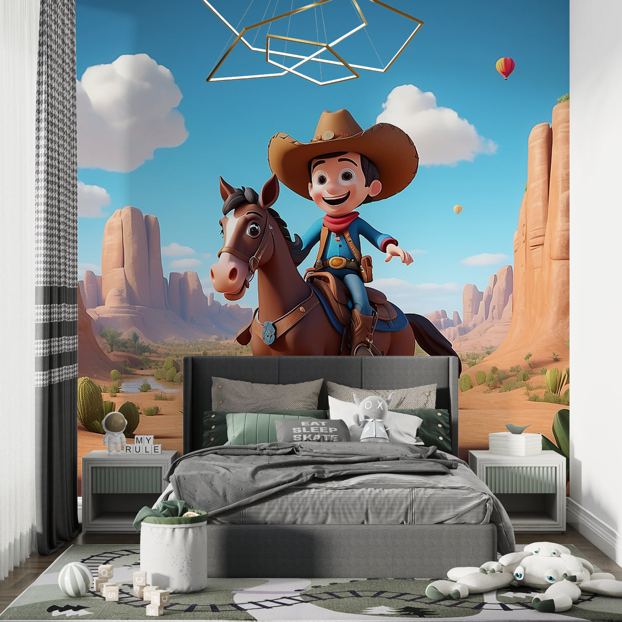 Ce papier peint d'aventure western donne vie à l'esprit du Far West avec son design animé vibrant. Sur fond de formations de grès imposantes et d'un ciel bleu cristallin parsemé de nuages blancs duveteux, la scène capture une fresque murale à thème cowboy délicieuse mettant en vedette un jeune cavalier joyeux à cheval. Des montgolfières flottent paresseusement au loin, ajoutant des touches fantaisistes à ce panorama désertique.