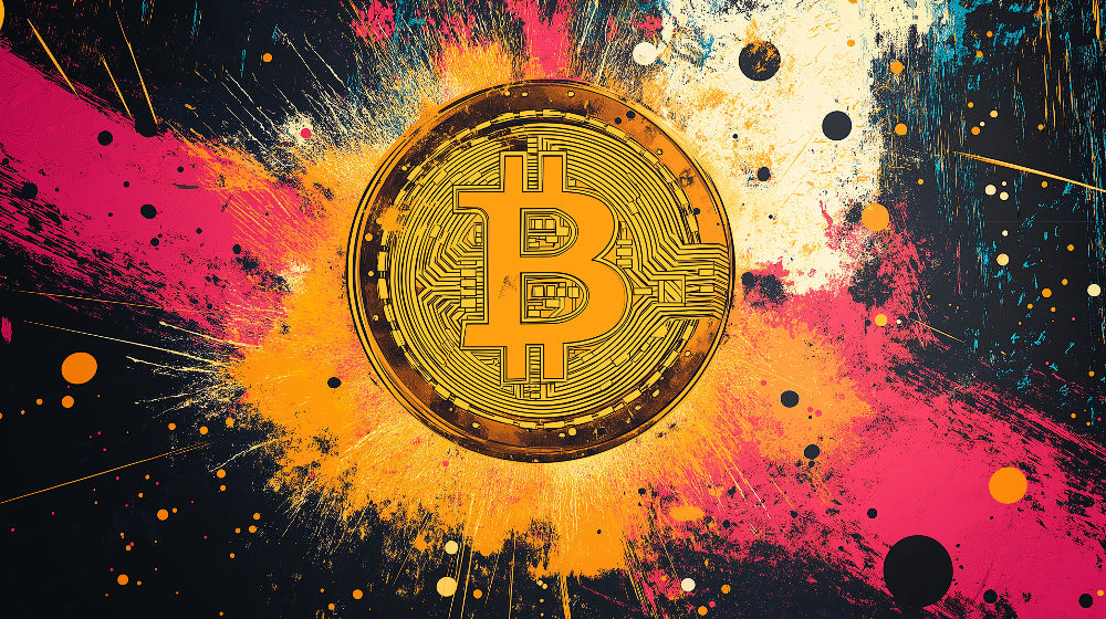Cette fresque murale de cryptomonnaie présente un symbole Bitcoin doré saisissant émergeant d'une explosion d'énergie vibrante. Les motifs détaillés de circuit imprimé à l'intérieur de la pièce contrastent magnifiquement avec un arrière-plan dynamique de taches de peinture rose, orange et turquoise. Le design de papier peint bitcoin comporte des éclaboussures artistiques et des points orbitaux dispersés sur un fond noir profond, créant une esthétique qui capture parfaitement l'esprit révolutionnaire de la monnaie numérique.
