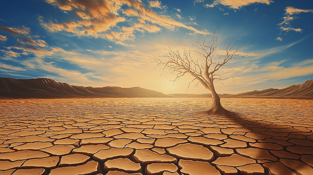 Ce papier peint paysage désertique capture un moment de drame naturel extraordinaire, où un arbre solitaire se tient résilient contre une vaste étendue de terre brûlée par le soleil. Le terrain craquelé et doré s'étend vers des montagnes lointaines tandis qu'au-dessus, une fresque murale ciel au coucher du soleil s'embrase de nuages teintés d'ambre contre des hauteurs d'azur profond. Les branches nues s'élèvent, créant une silhouette saisissante contre le fond lumineux, incarnant à la fois la force et la beauté délicate dans les extrêmes de la nature.