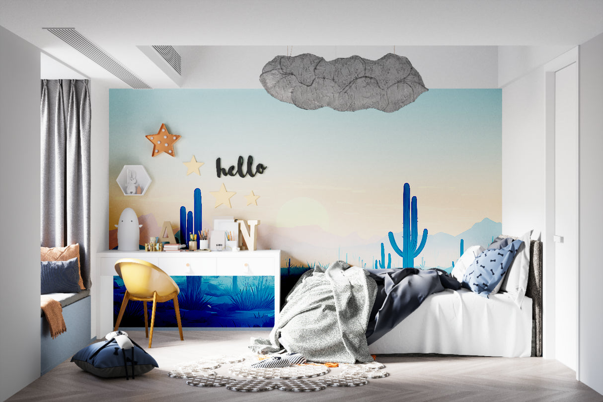 Transformez n'importe quel espace en un refuge désertique immersif avec ce papier peint mural cactus. La palette de couleurs douces du design, composée de bleus, de turquoise et d'oranges de coucher de soleil, crée une atmosphère apaisante mais inspirante. Parfait pour créer une esthétique papier peint thème sud-ouest qui apporte la beauté indomptée des paysages désertiques à l'intérieur, en faisant un choix idéal pour ceux qui cherchent à ajouter une touche de merveille naturelle à leurs espaces intérieurs.