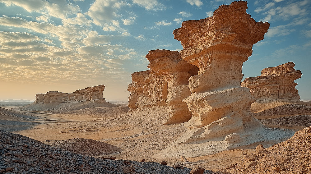 Ce papier peint paysage désertique capture la beauté brute des formations de grès sculptées par le vent s'élevant majestueusement contre un ciel serein. Les roches naturelles de couleur terre cuite affichent des couches complexes sculptées par le temps, tandis que des nuages légers captent la lumière dorée du crépuscule. Le papier peint rocher du désert met en valeur l'art de la nature dans la sculpture de ces monuments imposants, créant une composition qui équilibre une échelle dramatique avec des transitions de couleurs subtiles.