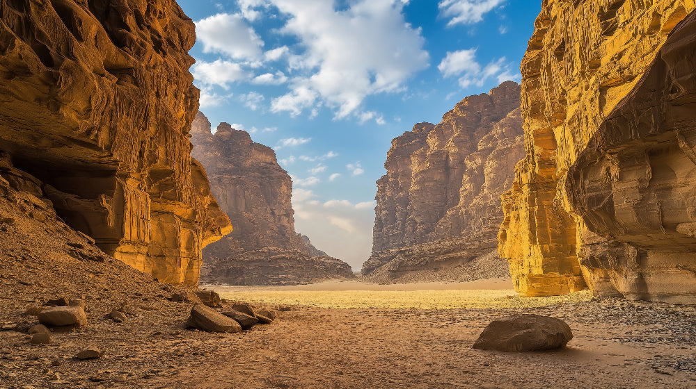 Ce papier peint canyon désertique capture la grandeur brute de l'architecture de la nature, où des falaises ocre imposantes s'élèvent de manière spectaculaire contre un ciel bleu immaculé parsemé de nuages légers. Les formations naturelles présentent des couches complexes de grès séché au soleil, créant une riche tapisserie de teintes brun doré et d'ombres dramatiques. La fresque murale du canyon offre une perspective captivante à travers le corridor rocheux, guidant le regard vers un horizon lointain où la terre rencontre le ciel.