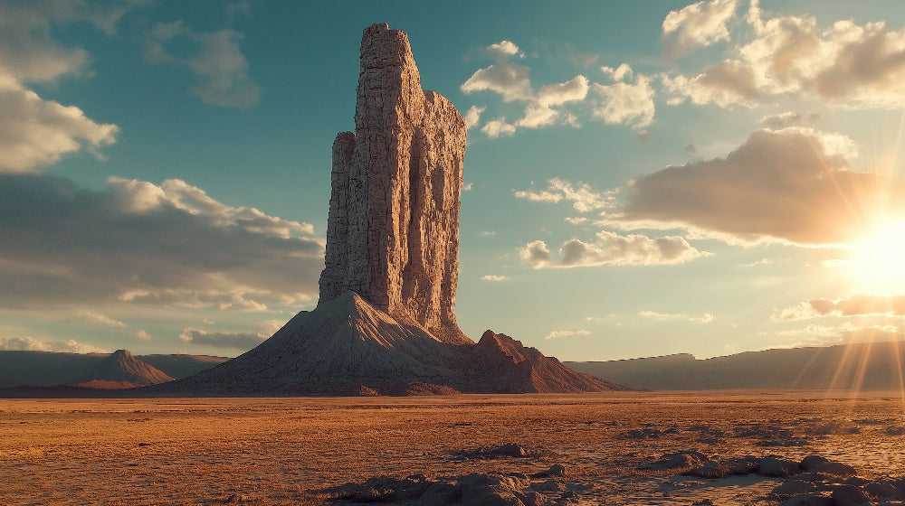 Ce papier peint paysage désertique capture la grandeur brute de l'architecture de la nature, présentant un monolithe de grès imposant s'élevant de manière spectaculaire contre un ciel turquoise-doré. La formation rocheuse massive veille sur la vaste plaine désertique, sa surface usée peinte en riches tons terre cuite par le soleil couchant. Des nuages éthérés dérivent à travers la fresque panoramique du désert, créant un jeu fascinant de lumière et d'ombre sur le terrain accidenté.