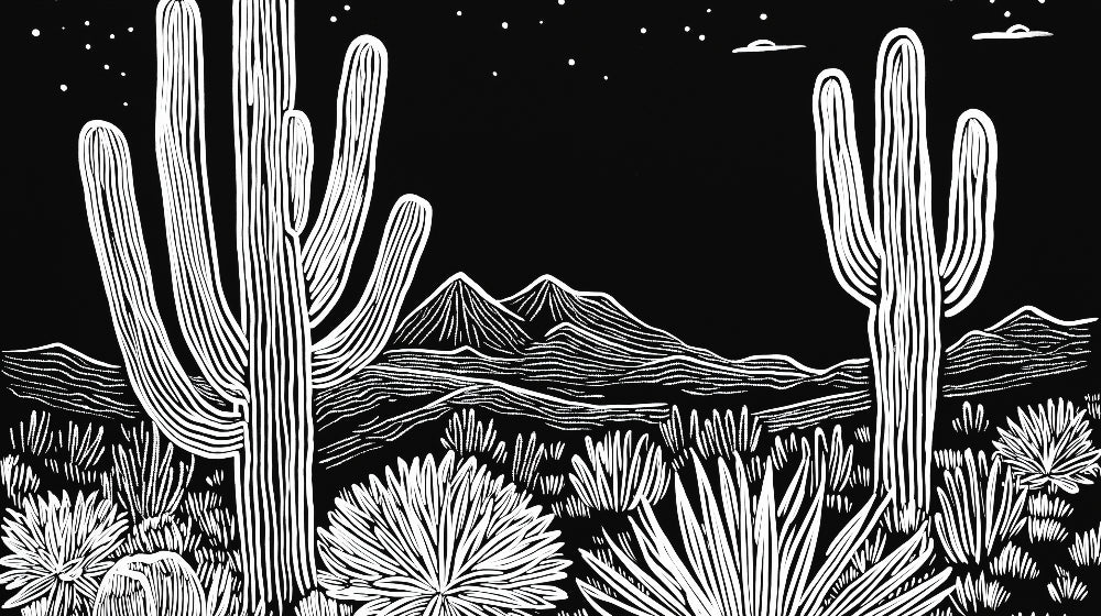 Ce papier peint paysage désertique présente un design monochromatique saisissant où de majestueux cactus saguaro s'élèvent sur un fond noir profond. La technique distinctive de dessin en lignes blanches crée un rythme sophistiqué de formes, avec de hauts muraux de cactus encadrant une chaîne de montagnes lointaine sous un ciel parsemé d'étoiles. Chaque élément est méticuleusement rendu avec des lignes fluides qui capturent l'essence de la beauté brute et des motifs naturels du désert.