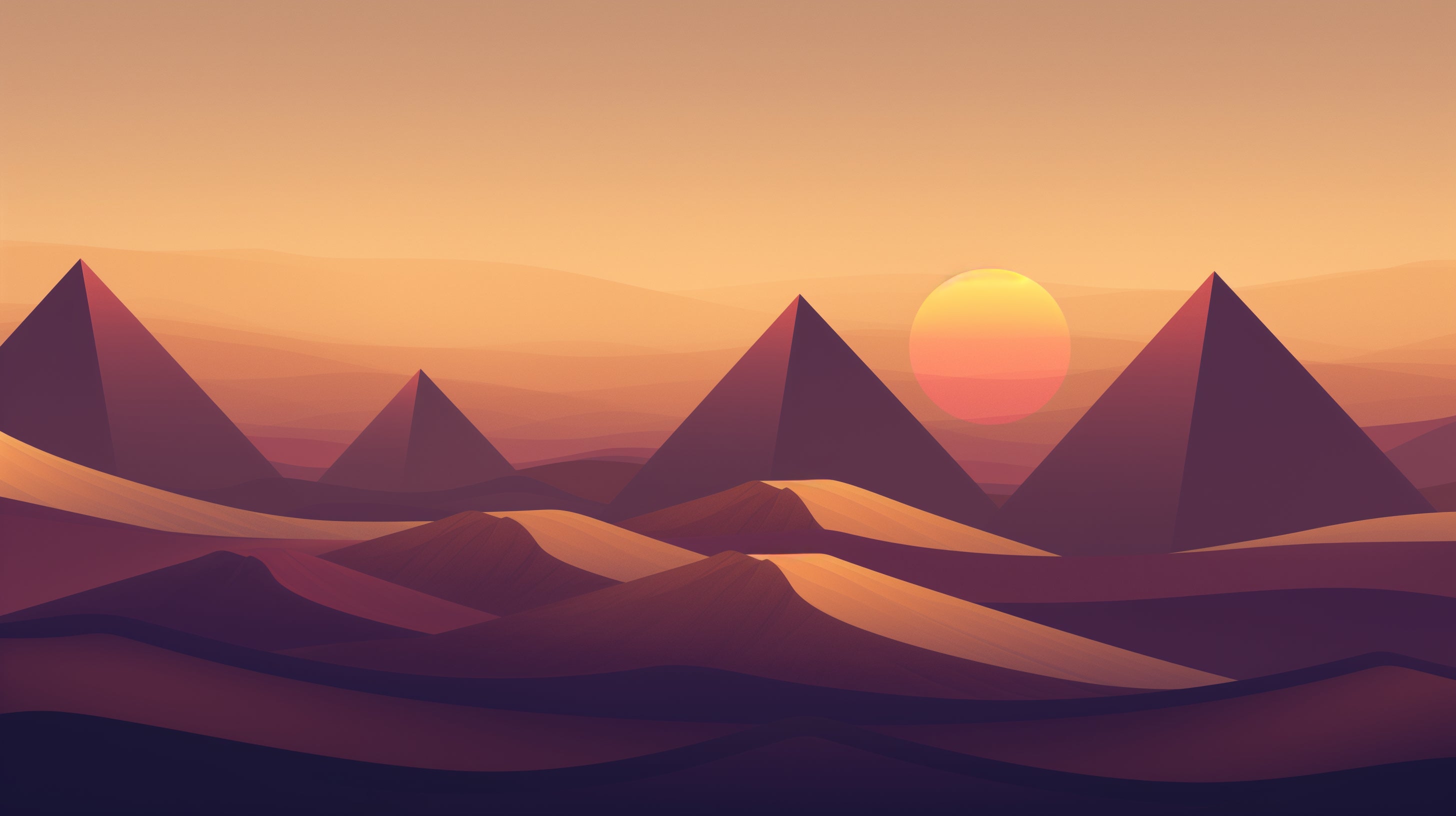 Ce papier peint paysage désertique capture la majesté intemporelle des pyramides anciennes silhouettées contre un coucher de soleil spectaculaire. La composition se déploie en riches couches de nuances violettes et orangées, où des pyramides géométriques s'élèvent de manière dramatique au-dessus des dunes de sable ondulantes. Le disque solaire lumineux baigne la scène d'une lumière ambre chaude, créant une fresque murale désertique minimaliste qui évoque le mystère et la beauté éternelle.