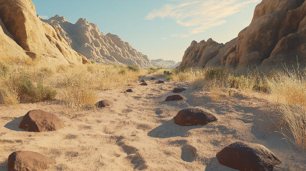 Ce papier peint paysage désertique capture la beauté brute du terrain le plus dramatique de la nature. Des formations de grès doré s'élèvent majestueusement contre un ciel turquoise serein, tandis que des rochers épars parsèment le chemin sablonneux sinueux. Le papier peint canyon met en valeur le jeu de lumière et d'ombre, avec des rochers baignés de soleil créant des teintes chaudes couleur miel qui se fondent harmonieusement avec la végétation désertique clairsemée.