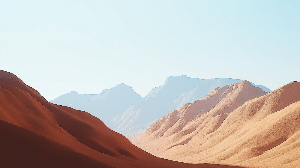 Ce papier peint paysage désertique met en valeur la beauté brute de la nature à travers un prisme minimaliste. De riches dunes en terre cuite balayent le premier plan en vagues chaudes et ondulantes, tandis que des collines couleur sable créent un plan intermédiaire fascinant. La composition s'élève pour rencontrer des pics de montagne papier peint lointains rendus dans des teintes bleu-gris douces, le tout sur un ciel serein qui ajoute profondeur et tranquillité à la scène.