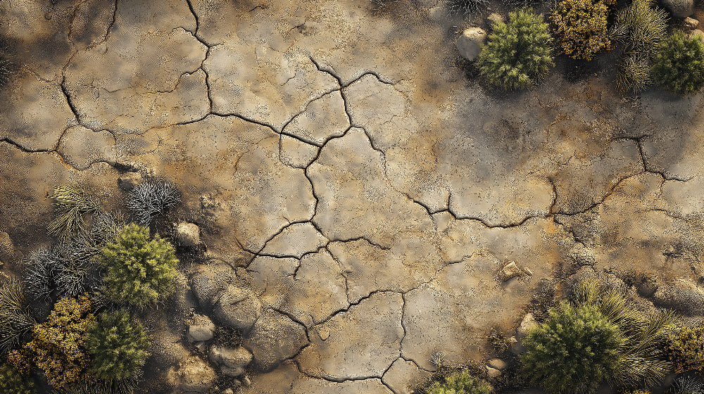 Ce papier peint paysage désertique capture la beauté brute du terrain aride avec une authenticité remarquable. Le réseau complexe de fissures desséchées par le soleil s'étend sur une terre aux tons beige, créant un motif naturel fascinant. Des groupes épars de végétation désertique résistante en verts et gris atténués ajoutent des touches organiques à la composition, tandis que des ombres et textures subtiles apportent de la profondeur à ce saisissant papier peint terrain aride.