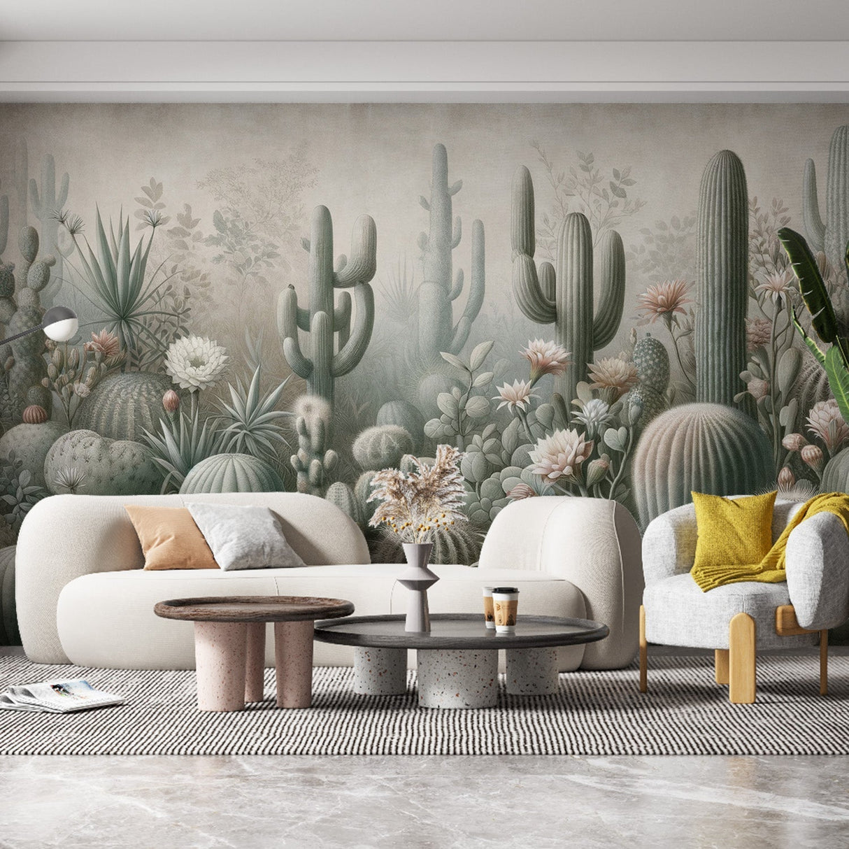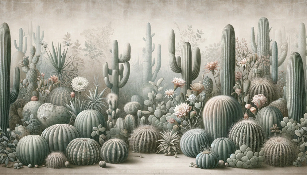 Papier Peint Mural Désert | Jardin de Cactus Vintage avec Fleurs