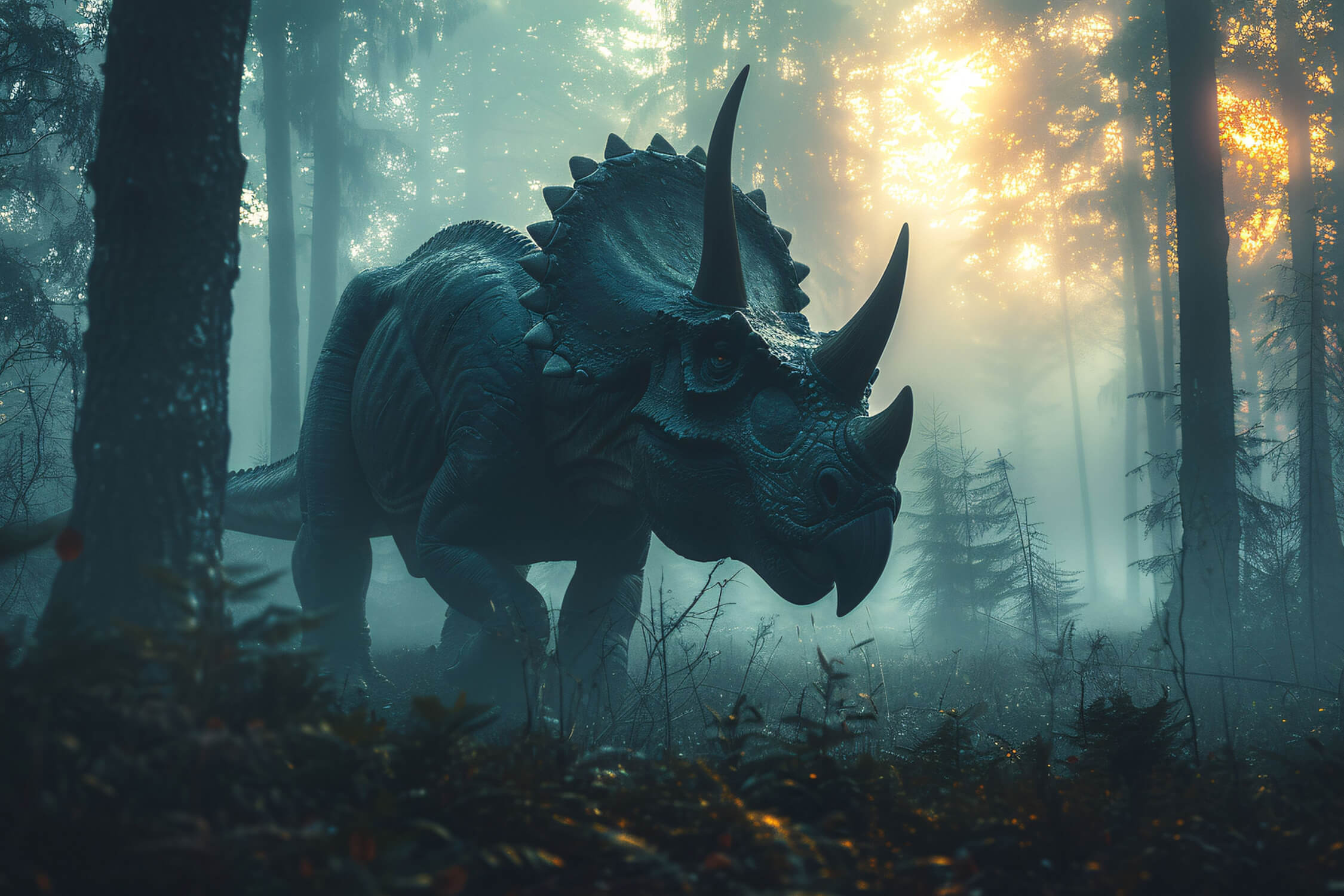 Cette fresque murale de dinosaure transporte les spectateurs dans une scène préhistorique fascinante où un magnifique T-Rex émerge d'un décor forestier brumeux. La composition dramatique présente une silhouette détaillée de tricératops contre une atmosphère éthérée vert-bleu, rehaussée par des rayons de soleil dorés filtrant à travers des arbres anciens. Ce papier peint préhistorique équilibre habilement une puissance intimidante avec une sophistication artistique, créant un mélange unique d'aventure et de mystère.