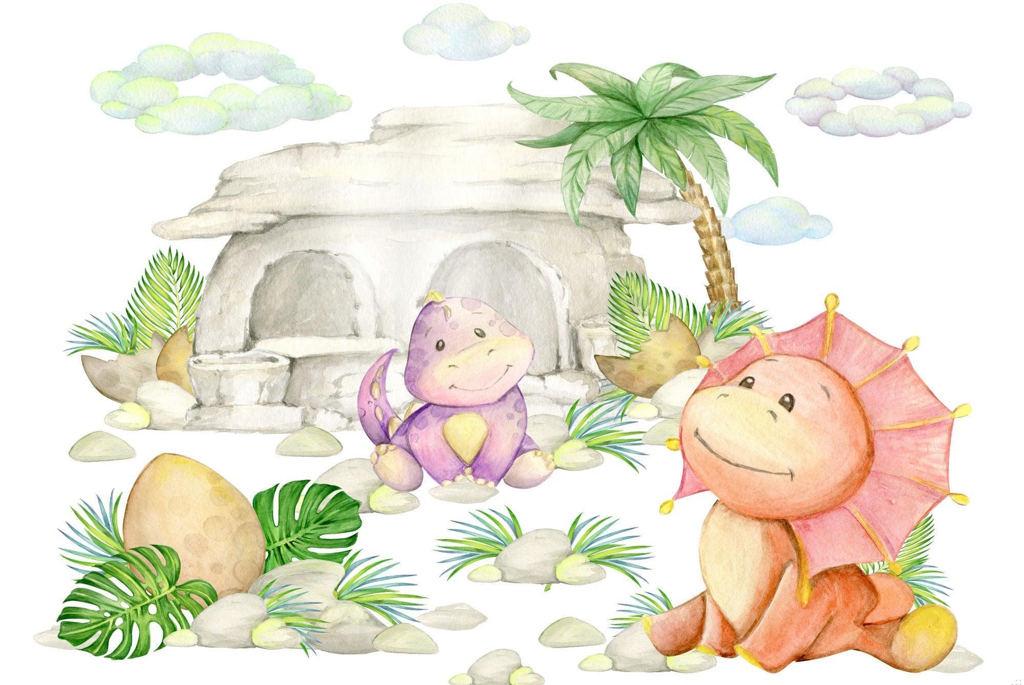 Cette fresque murale dinosaure enchanteresse donne vie à un monde préhistorique fantaisiste grâce à une délicate aquarelle artistique. Deux adorables dinosaures, un personnage corail-rose avec un parapluie ludique et un compagnon violet doux, habitent un décor tropical de rêve. La scène est complétée par un palmier vert doux, des nuages légers et des feuilles de palmier luxuriantes, le tout rendu dans des teintes douces et adaptées aux enfants sur un fond blanc tranquille.