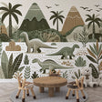 Ce papier peint mural dinosaure transporte les spectateurs dans un paysage préhistorique serein où de doux géants errent parmi une végétation luxuriante. Le design artistique présente des dinosaures magnifiquement stylisés dans des tons apaisants de vert sauge et beige, sur un fond de montagnes majestueuses et de palmiers imposants. Le papier peint préhistorique combine des éléments botaniques détaillés avec de charmantes illustrations de dinosaures, créant une composition sophistiquée mais ludique qui stimule l'imagination.