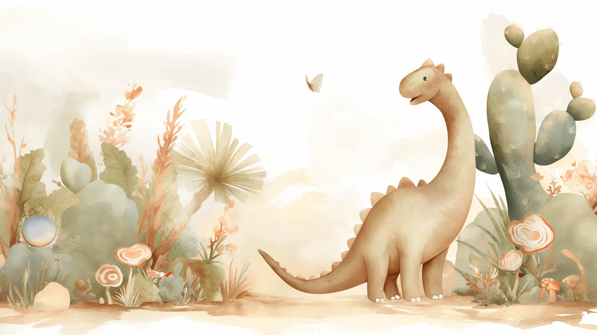 Ce papier peint dinosaure crée une scène préhistorique enchanteresse avec un brachiosaure brun doux comme pièce maîtresse. Sur un fond aquarelle doux, le dinosaure amical est entouré de délicates fleurs teintées de corail, de feuillage vert sauge et de palmes dorées qui créent un environnement naturel et onirique. Un papillon délicat danse dans l'air, ajoutant une touche fantaisiste à cette fresque murale dinosaure pour enfants qui mêle habilement fantaisie et sophistication artistique.