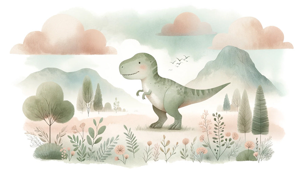 Des couleurs douces et un design amical rendent ce papier peint mural T-Rex parfait pour de doux rêves.