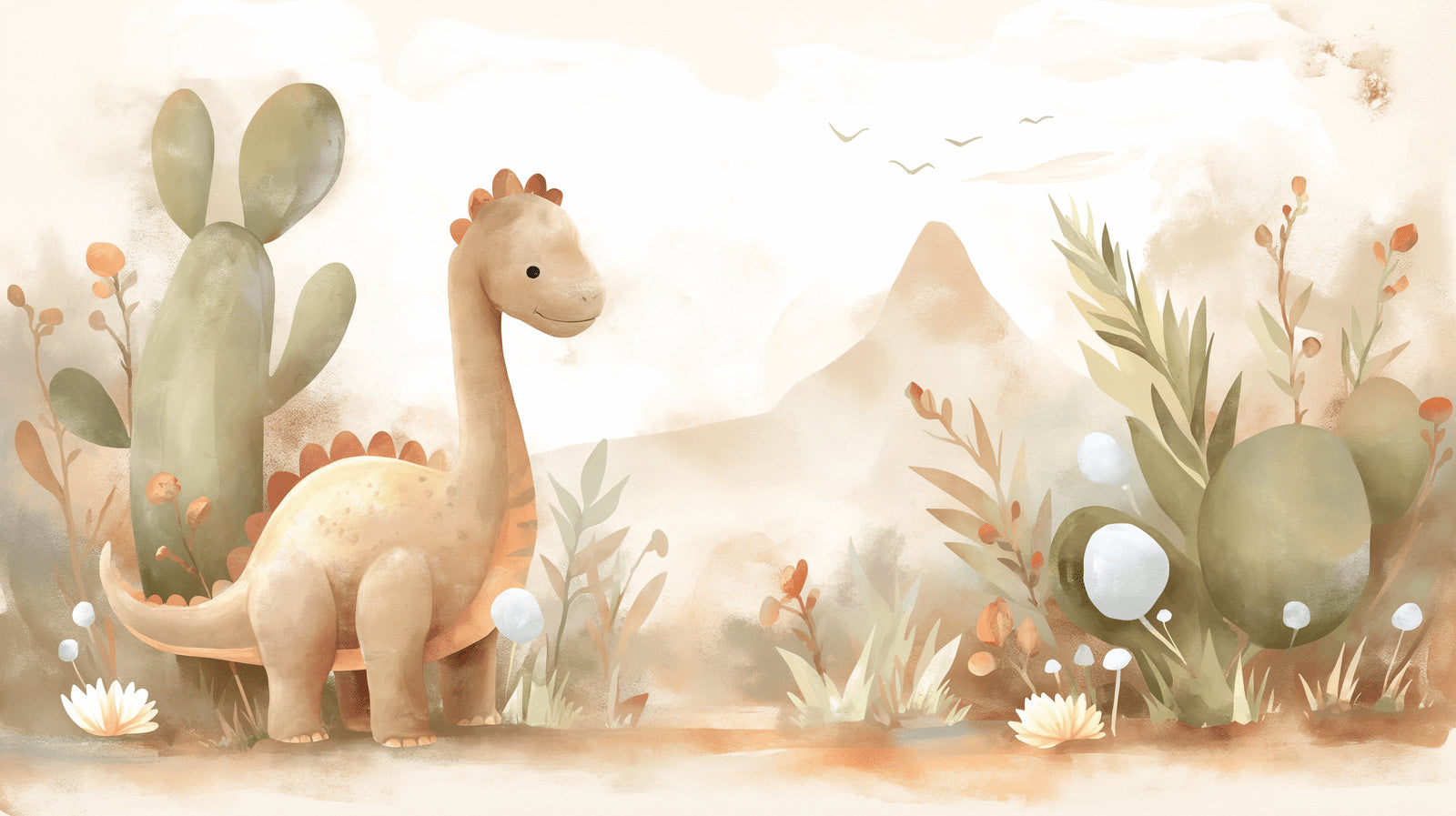 Ce papier peint mural dinosaure présente une scène préhistorique charmante où un brontosaure amical occupe le devant de la scène sur un paysage beige doux. Le géant doux est rendu dans des tons chauds de terre cuite, entouré de feuillage vert olive délicat et de montagnes brumeuses. Le papier peint dinosaure pour enfants comporte des détails réfléchis comme des oiseaux flottants et des éléments botaniques subtils qui créent une atmosphère sereine et rêveuse.
