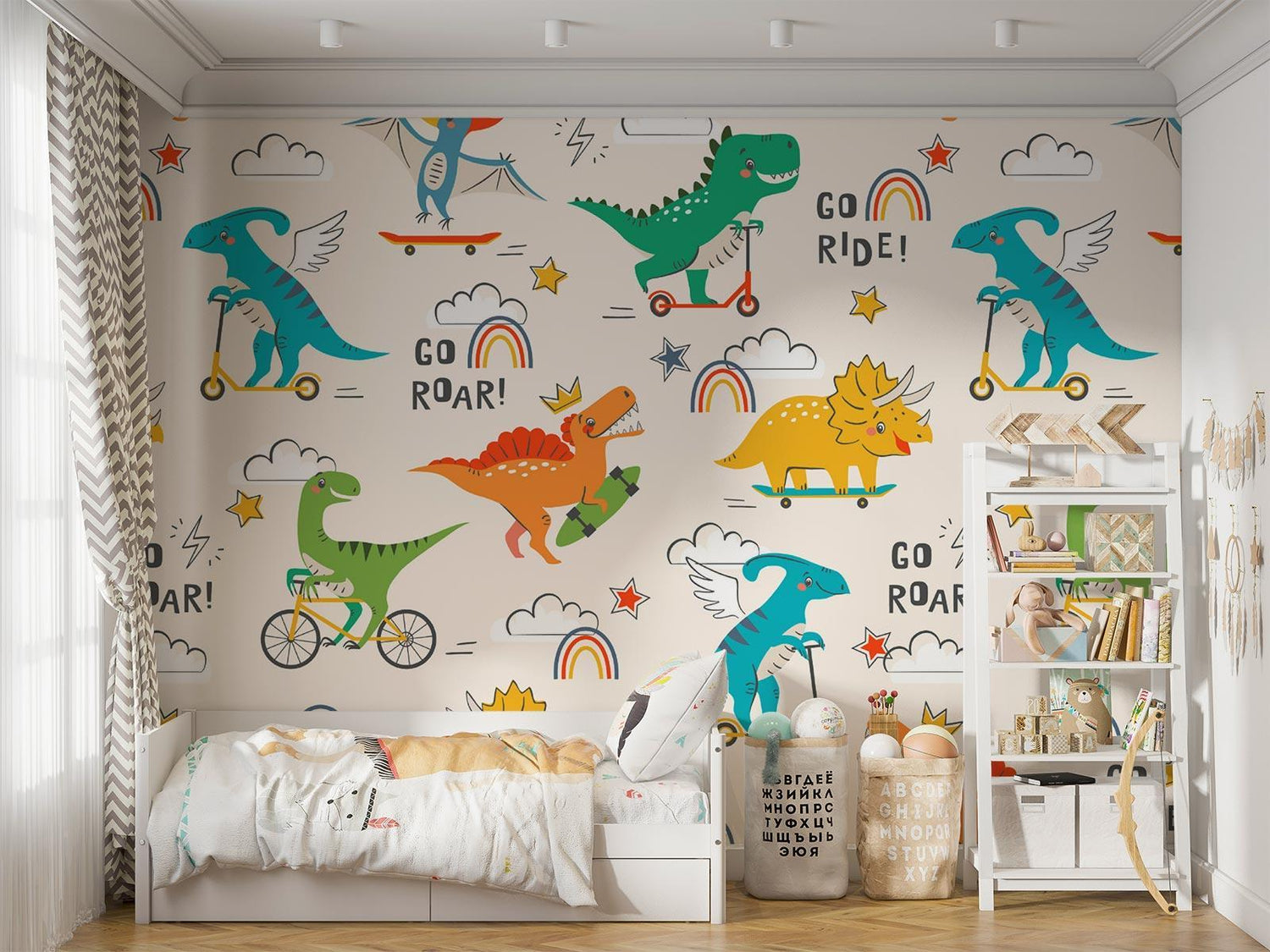 Cette charmante fresque murale de papier peint dinosaure donne vie à un monde d'aventure fantaisiste avec sa joyeuse troupe d'athlètes préhistoriques. Des dinosaures colorés en turquoise, vert, orange et jaune chevauchent des trottinettes, des skateboards et des bicyclettes sur un fond beige doux. Des arcs-en-ciel joyeux, des nuages blancs duveteux et des étoiles scintillantes créent une atmosphère ludique, tandis que le texte répété 'Go Ride' ajoute un élément sportif encourageant à cette fresque murale murale dinosaure pour enfants.
