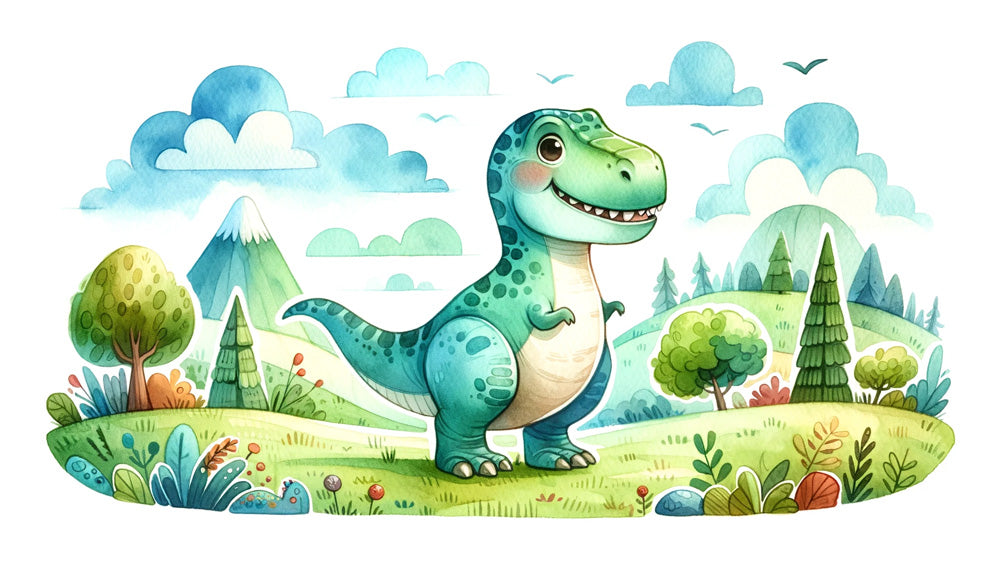 Papier Peint Mural Dinosaure | T-Rex Ludique dans un Paysage Aquarelle