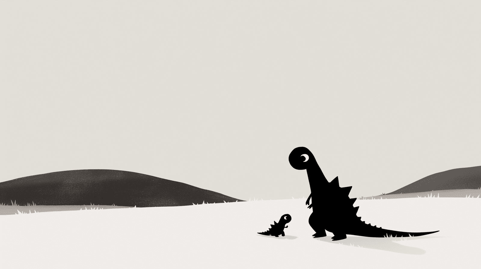 Ce papier peint dinosaure noir et blanc capture une scène touchante avec deux charmants dinosaures en silhouette contre un paysage serein. Le dinosaure plus grand se tient protecteur à côté de son compagnon plus petit, créant un récit émouvant dans une composition minimaliste. Les douces collines ondulantes et les détails délicats de l'herbe en tons monochromes établissent une fresque murale dinosaure moderne qui équilibre sophistication et charme ludique.