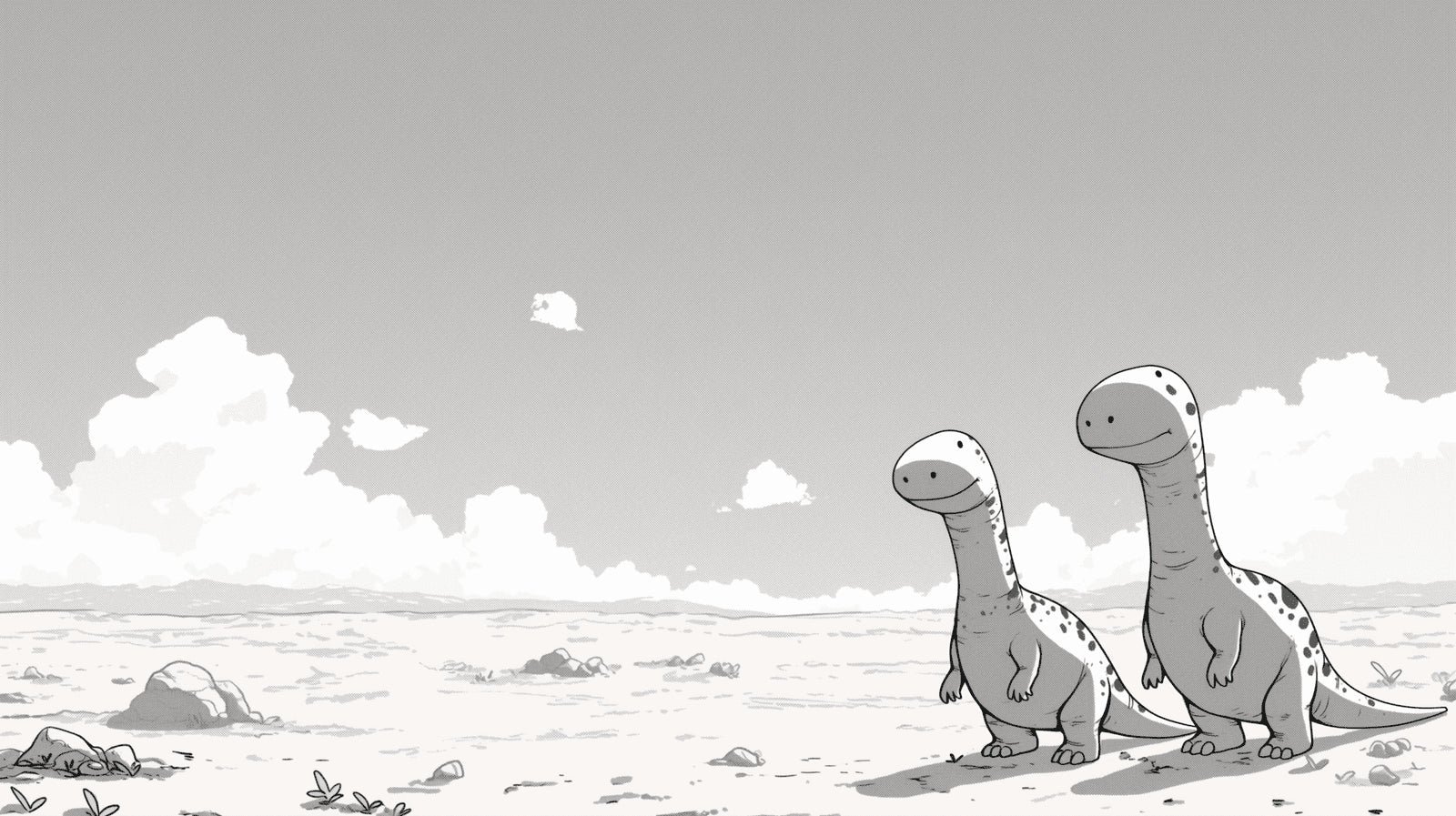 Cette charmante fresque murale de papier peint dinosaure présente deux compagnons T-Rex attachants sur un paysage monochrome minimaliste. L'illustration en nuances de gris capture les amis préhistoriques dans un décor désertique serein, avec des nuages duveteux ponctuant l'horizon. Le style artistique combine un design de personnage fantaisiste avec de l'art mural dinosaure moderne, créant une atmosphère sophistiquée mais ludique.