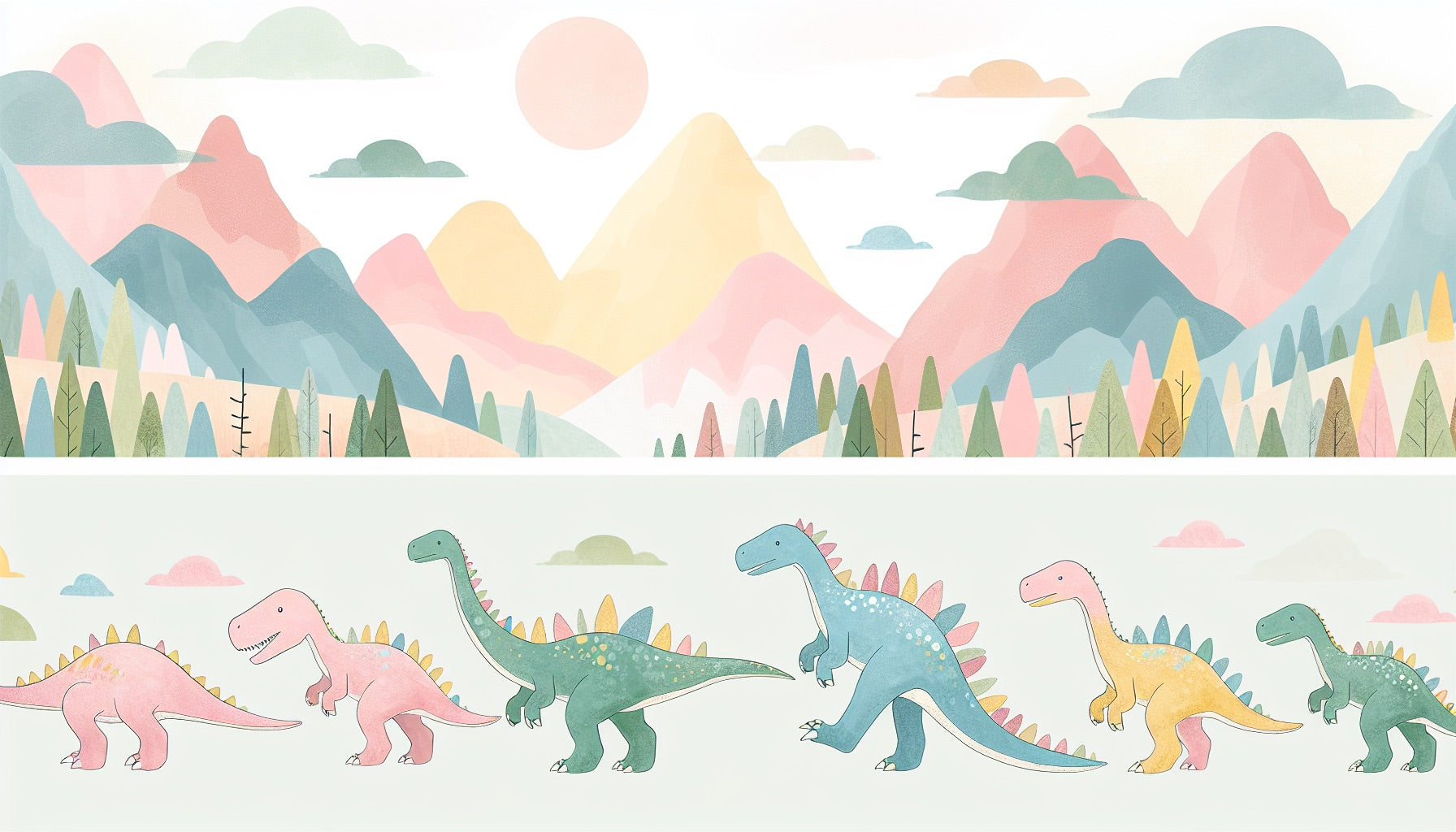 Ce papier peint mural dinosaure crée un monde fantaisiste où de doux dinosaures défilent devant un décor de montagnes oniriques. La palette douce présente des sommets rose pastel, vert menthe et jaune beurre s'élevant sous un ciel serein, tandis que de charmants motifs de bébés dinosaures marchent joyeusement le long de la bordure inférieure. Chaque créature préhistorique est représentée dans des couleurs douces et adaptées aux enfants avec des pointes et des points délicats, créant un défilé enchanteur de compagnons préhistoriques.