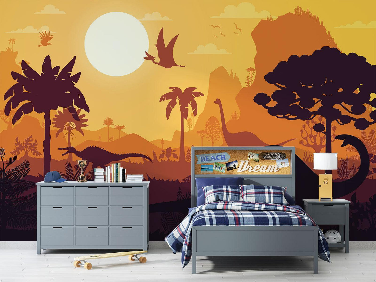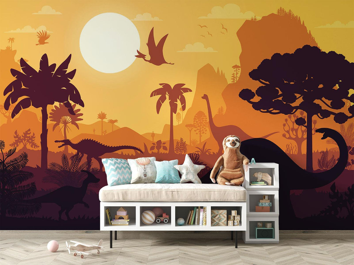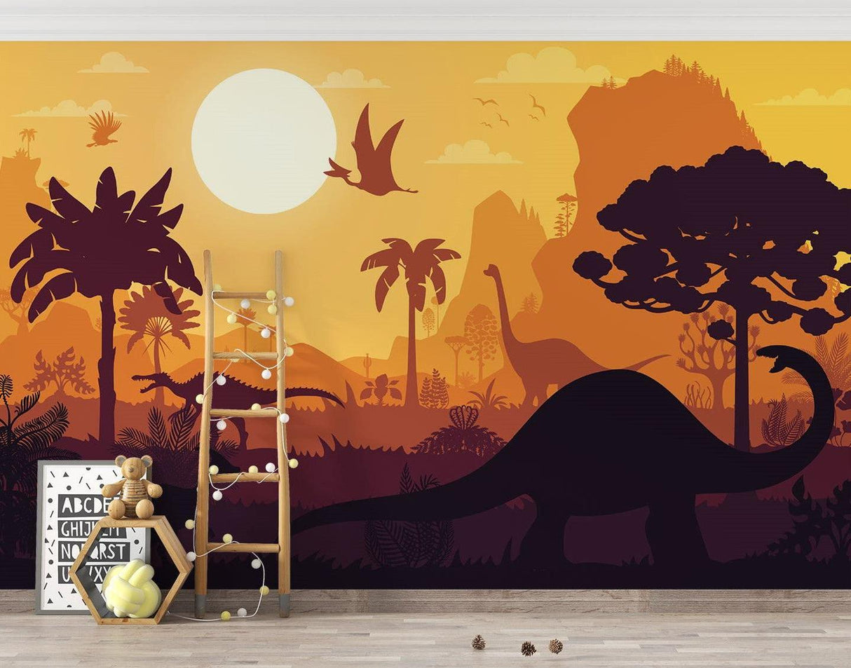 Ce captivant papier peint mural dinosaure dépeint un paysage préhistorique fascinant baigné de teintes dorées du coucher de soleil. Des silhouettes de magnifiques dinosaures errent sous des palmiers imposants et des forêts anciennes, tandis que des ptérodactyles planent à travers le ciel ambré. Le papier peint préhistorique crée un contraste saisissant entre les ombres violet profond et la lueur orange chaude du soleil couchant, avec des montagnes majestueuses s'élevant en arrière-plan.