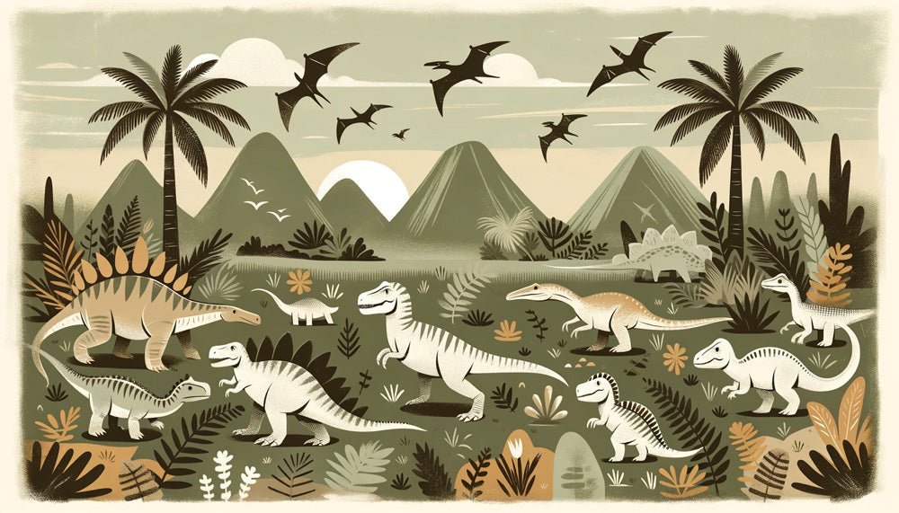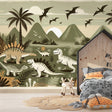 Ce papier peint mural dinosaure transporte les spectateurs dans un paysage préhistorique captivant où de doux géants errent sous des palmiers imposants et des ptérodactyles en plein vol. Sur un fond vert olive serein, l'illustration détaillée présente diverses espèces de dinosaures rendues en tons beige doux, créant un équilibre harmonieux avec le feuillage tropical et les montagnes majestueuses. Le papier peint préhistorique combine habilement une végétation aux tons terreux avec un ciel de coucher de soleil onirique, offrant une interprétation sophistiquée d'un thème classique de dinosaures.