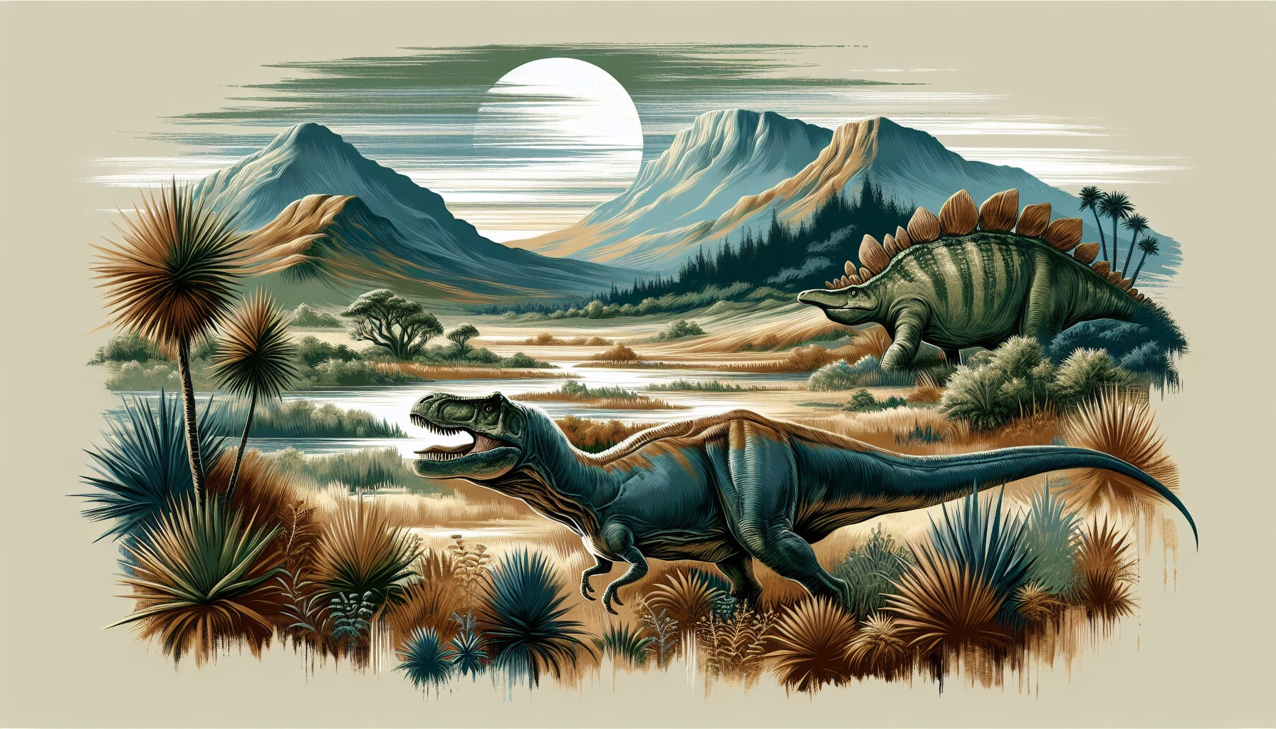 Ce papier peint mural dinosaure capture un paysage jurassique à couper le souffle où de majestueux T-Rex et Stegosaurus errent devant des montagnes bleu sarcelle imposantes. La scène se déroule sous une pleine lune lumineuse, projetant une lumière éthérée sur le terrain. Des tons terre riches se mêlent à des verts et bleus profonds, tandis que la végétation semblable à des palmiers ajoute une authenticité préhistorique à ce papier peint paysage dinosaure. Le rendu artistique combine un détail dramatique avec une palette de couleurs sophistiquée.