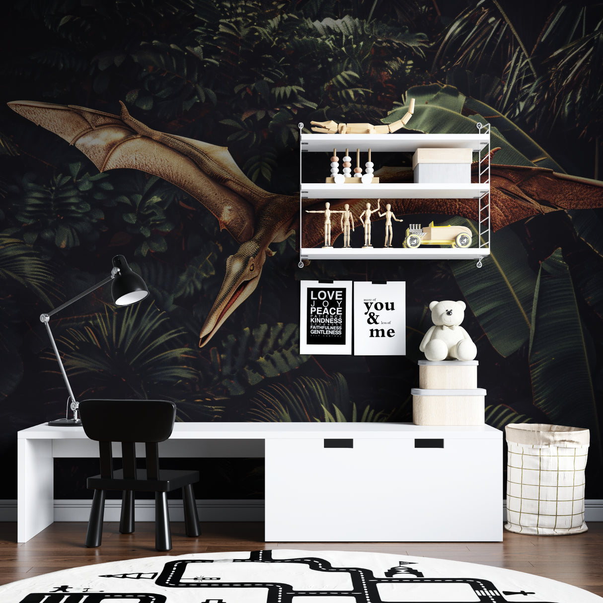 L'espace de votre enfant se transforme avec ce design de papier peint dinosaure jungle.