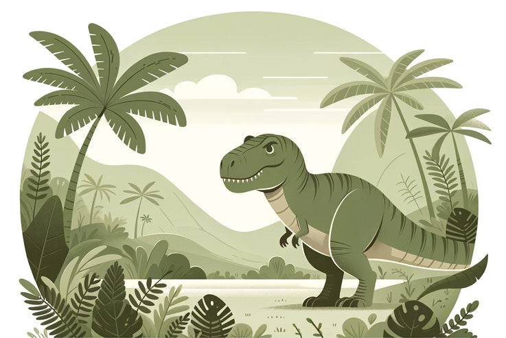 Cette fresque murale dinosaure transporte les spectateurs dans un paysage préhistorique serein où un T-Rex amical se promène parmi des palmiers imposants. L'œuvre présente un Tyrannosaurus Rex magnifiquement illustré, rendu dans des tons vert olive apaisants, sur un fond monochromatique brumeux. Le papier peint dinosaure tropical combine les courbes douces des feuilles de palmier avec une végétation préhistorique détaillée, créant un équilibre harmonieux entre la créature puissante et son environnement luxuriant.
