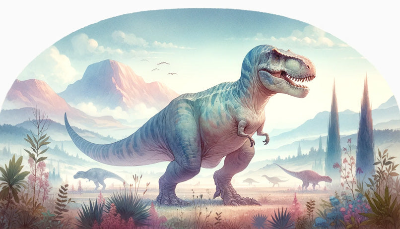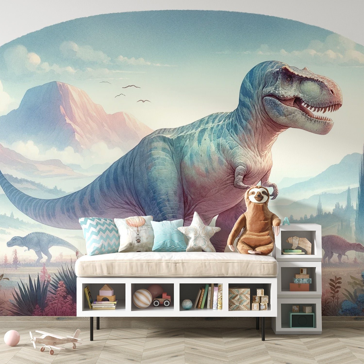 Ce papier peint mural dinosaure capture un majestueux T-Rex avec un détail à couper le souffle, placé dans un paysage préhistorique onirique. La créature aux teintes bleutées domine la scène avec des textures réalistes et des motifs d'écailles, tandis que des montagnes rose pâle s'élèvent gracieusement en arrière-plan. Le premier plan fleurit avec une flore ancienne aux pastels doux et aux verts profonds, créant un papier peint paysage préhistorique qui équilibre puissance et beauté artistique.