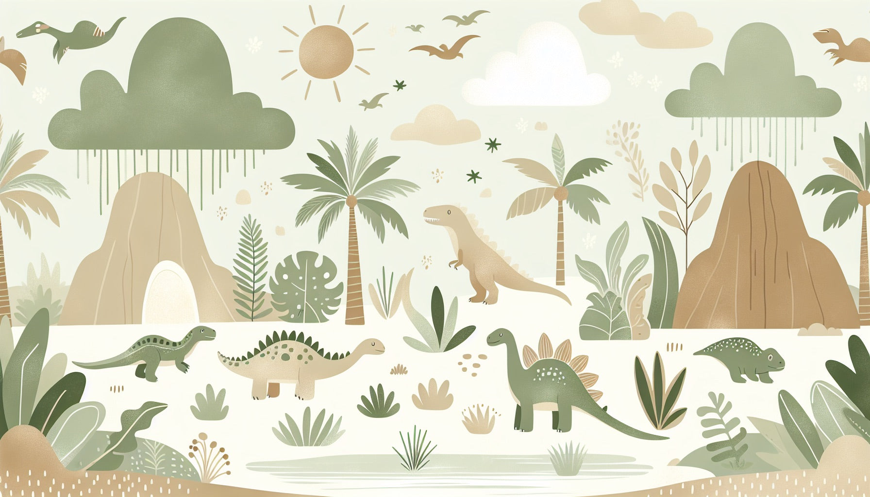 Ce papier peint mural dinosaure crée un monde préhistorique enchanteur rendu dans des tons apaisants de sauge verte et de beige. De doux dinosaures errent à travers un paysage tropical parsemé de palmiers, de feuilles de monstera et de flore indigène. Le papier peint préhistorique présente des détails charmants comme des nuages flottants, un soleil chaud et des ptérodactyles en vol qui ajoutent du mouvement et de la profondeur à la scène.