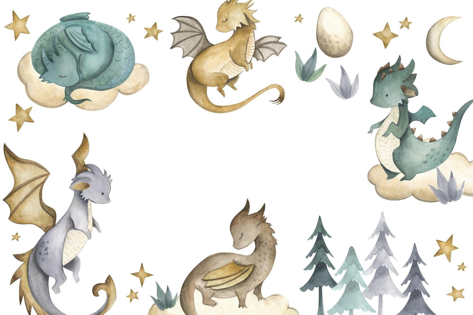Les aquarelles douces et les détails délicats font de ce papier peint mural dragon fantastique un décor de rêve pour les histoires du coucher.