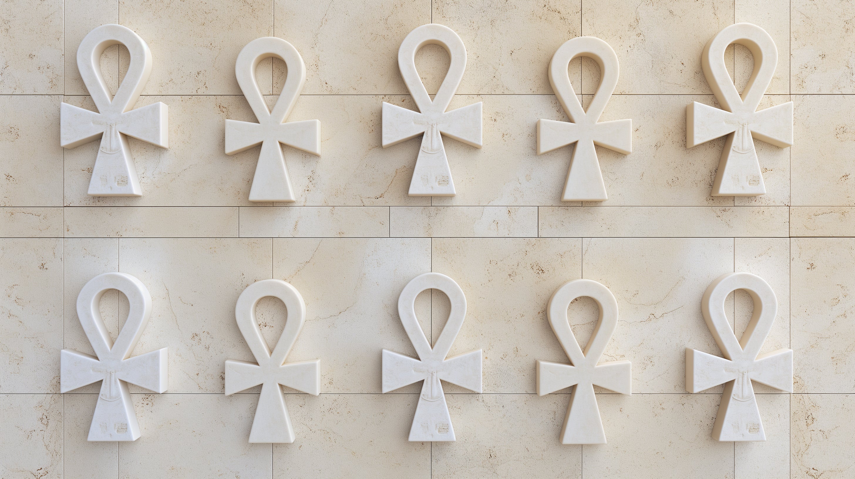Cette fresque murale égyptienne présente une disposition saisissante de symboles Ankh tridimensionnels, la croix de vie de l'Égypte ancienne, méticuleusement rendus en blanc pur sur un fond subtil de marbre beige. Chaque élément de papier peint géométrique 3D crée un jeu sophistiqué de lumière et d'ombre, avec le motif répétitif offrant à la fois rythme et profondeur à l'ensemble du design. La qualité sculpturale de chaque symbole Ankh apporte un intérêt architectural tout en conservant une esthétique élégante et moderne.