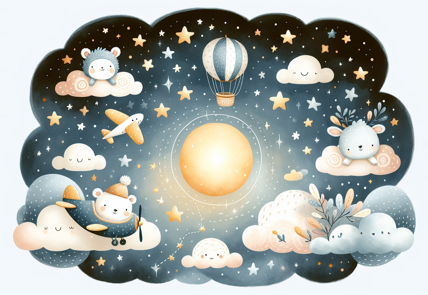 Cette fresque murale pour chambre de bébé enchanteresse crée une scène nocturne magique remplie de personnages fantaisistes et de merveilles célestes. Sur un ciel bleu-gris profond, d'adorables amis animaux flottent parmi des nuages blanc doux et des étoiles dorées. La lune centrale diffuse une lueur chaleureuse tandis que de mignons ours pilotent des avions et se reposent sur des nuages, accompagnés d'une charmante montgolfière dérivant à travers l'atmosphère étoilée.