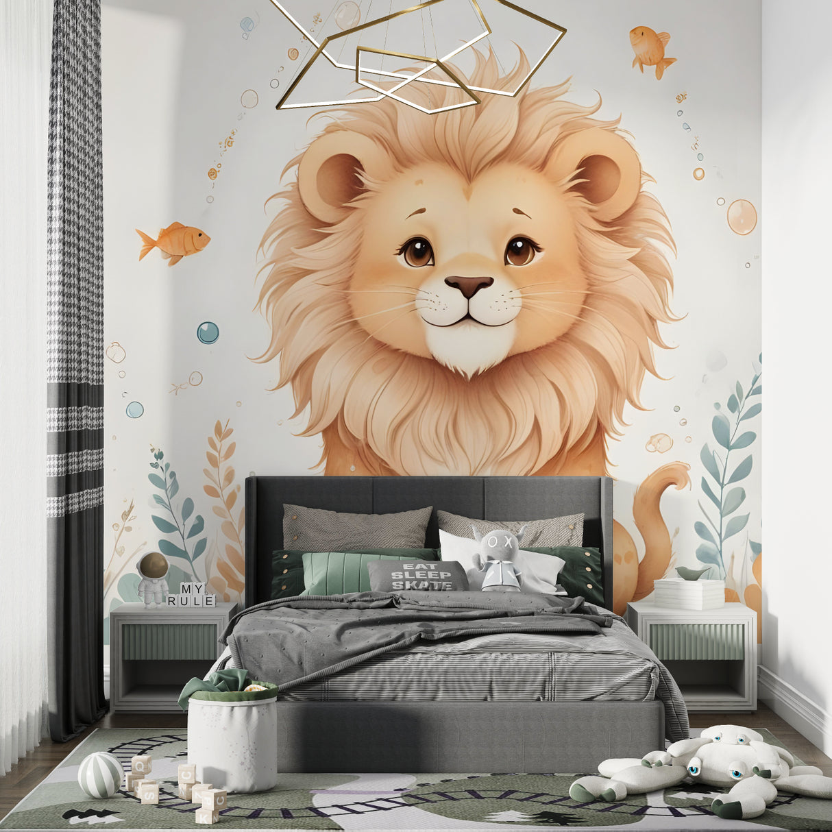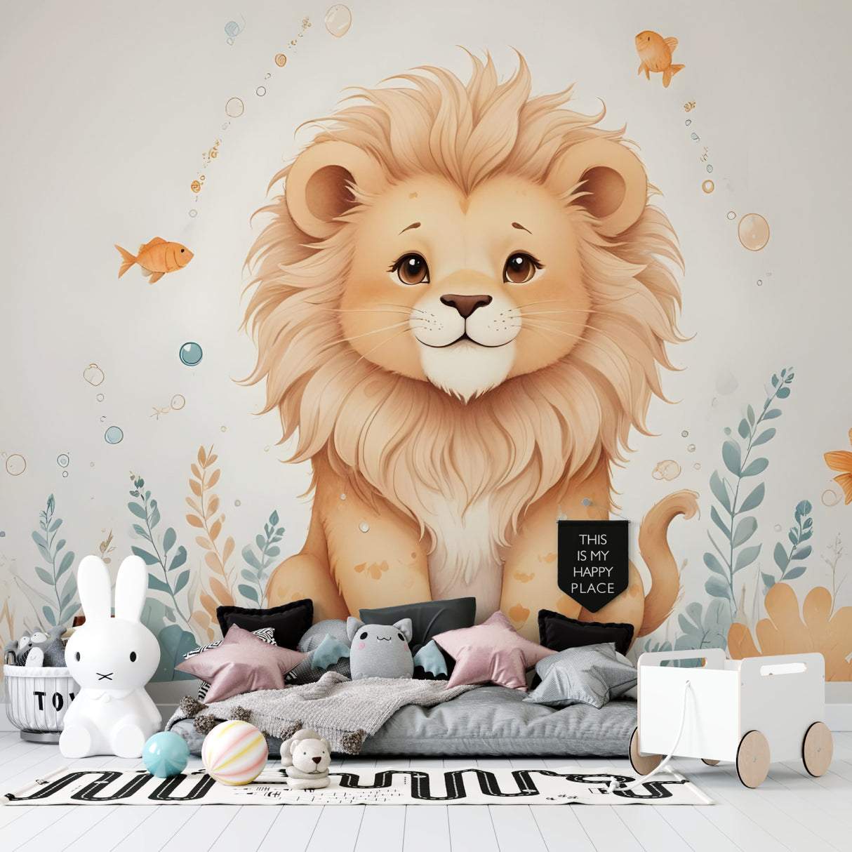 Papier Peint Mural pour Enfants | Lion Mignon avec Poisson Rouge et Feuillage