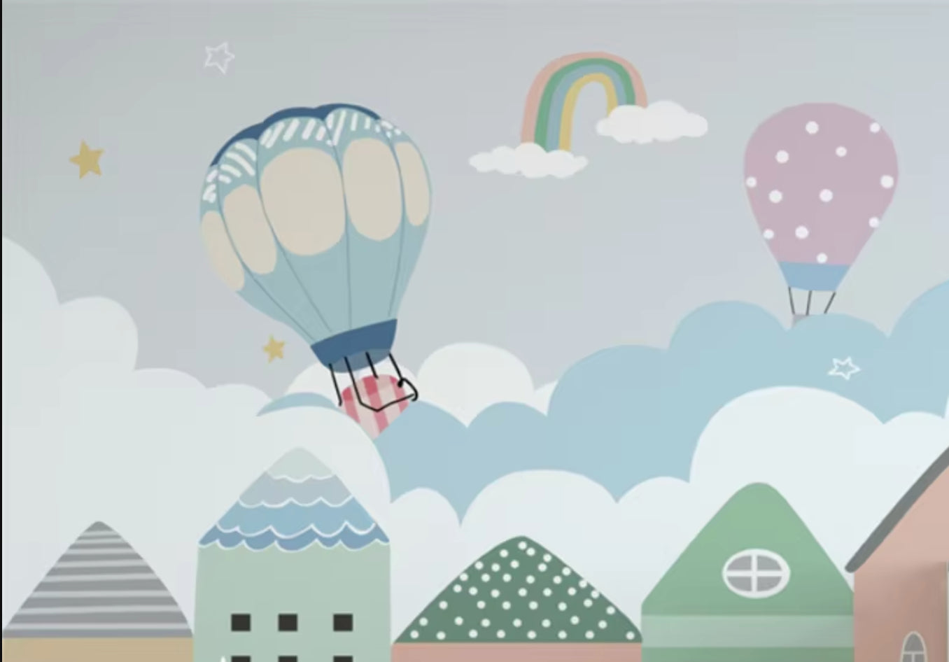 Ce papier peint pour chambre de bébé enchanteur capture un ciel fantaisiste où des montgolfières bleu doux dérivent paresseusement parmi des nuages blancs et duveteux. Un délicat arc-en-ciel pastel s'arque gracieusement à travers la scène, tandis que des ballons à pois charmants flottent au-dessus d'une collection de maisons géométriques douces en vert menthe, rose poudré et tons beige doux. Des étoiles dorées parsèment le ciel pâle, ajoutant une touche de magie à ce design de papier peint nuage.
