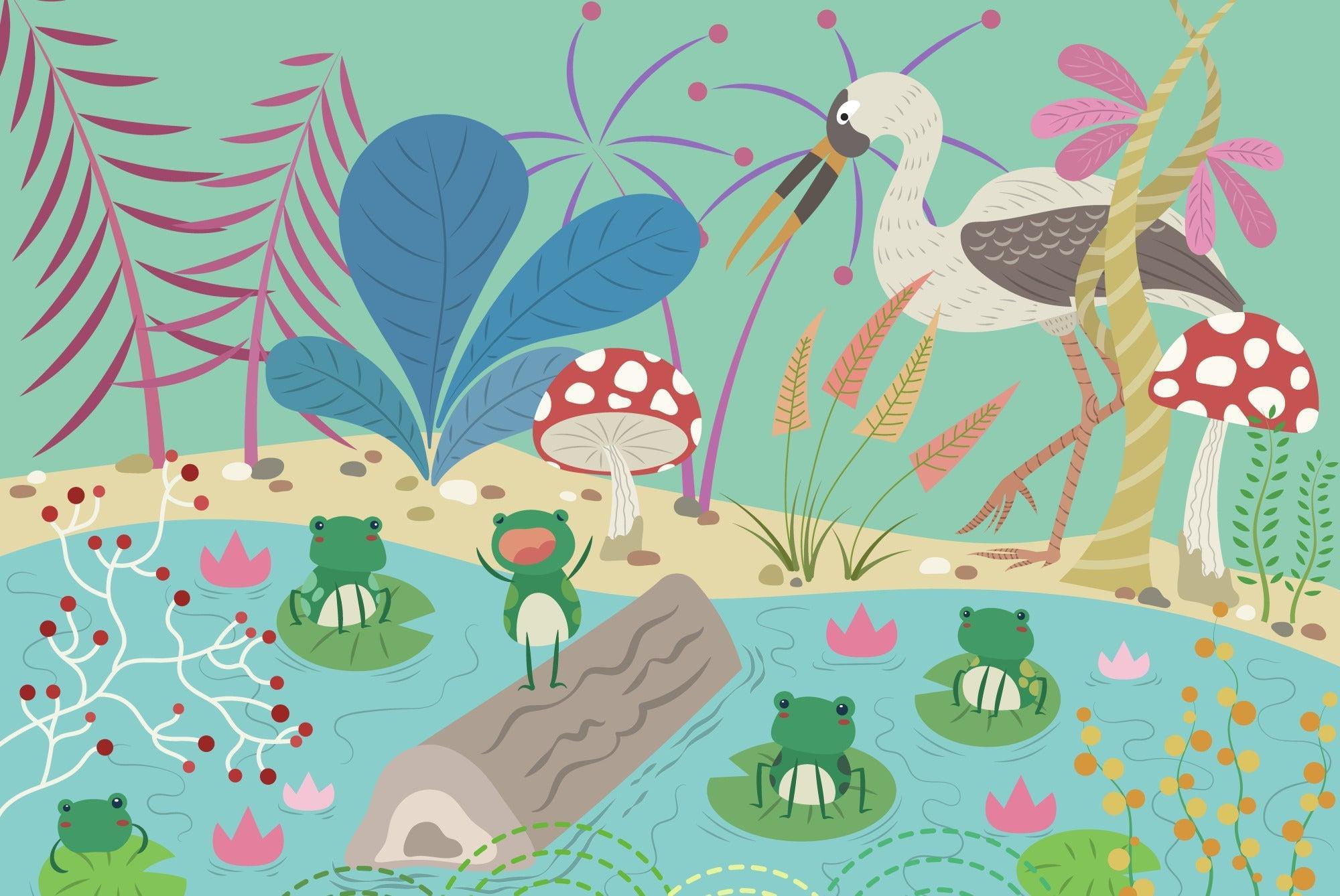 Papier Peint Mural Enfants Fantaisie | Étang Magique avec Grenouilles et Oiseaux