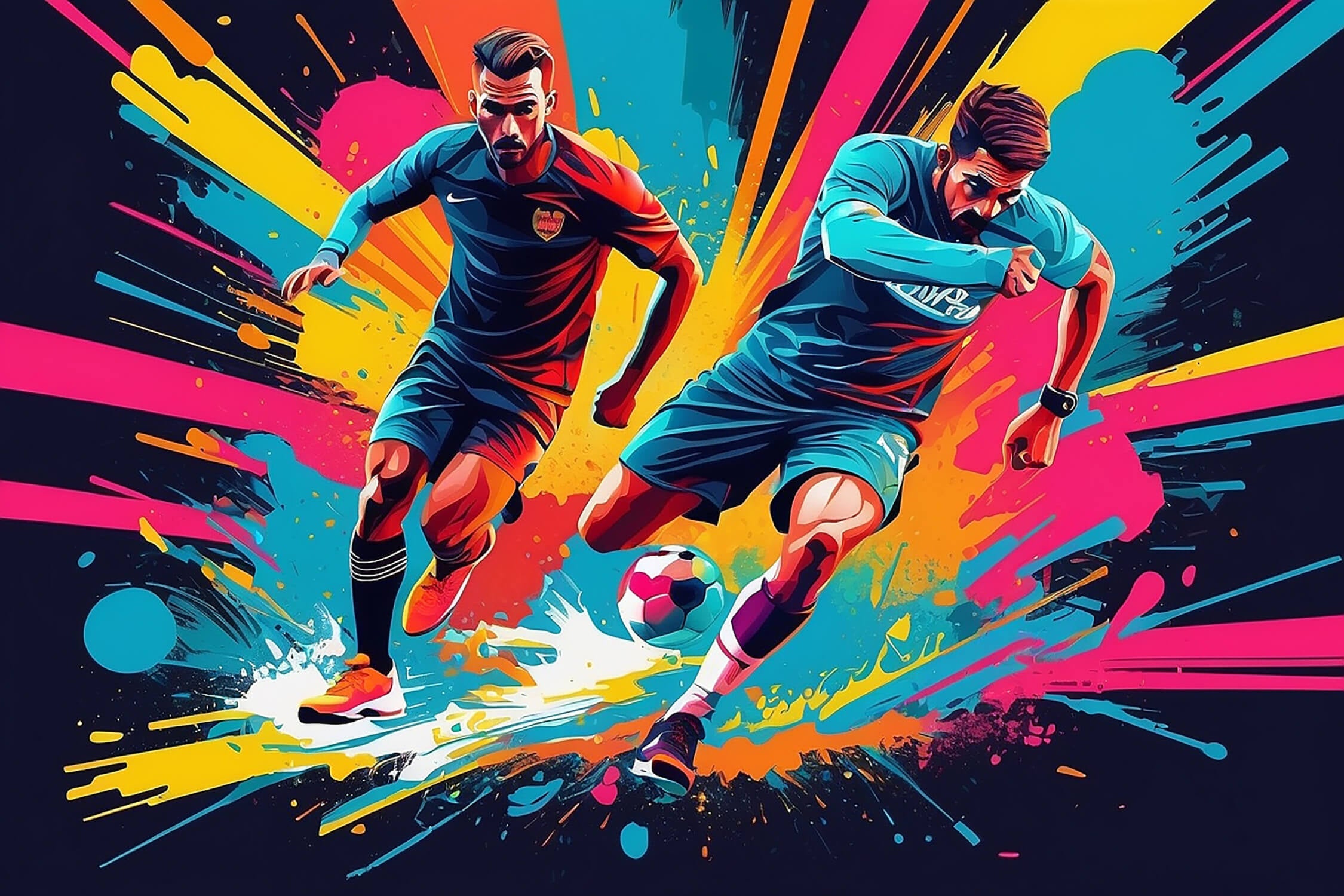 Cette fresque murale de papier peint football déborde d'énergie électrique grâce à son style vibrant d'art de rue. Des figures dynamiques en mouvement sont représentées en turquoise et orange audacieux sur un fond explosif de taches de peinture jaune, rose et bleue. Le papier peint graffiti sportif capture l'intensité brute du beau jeu à travers une esthétique urbaine contemporaine, créant un impact visuel puissant qui capte l'attention.