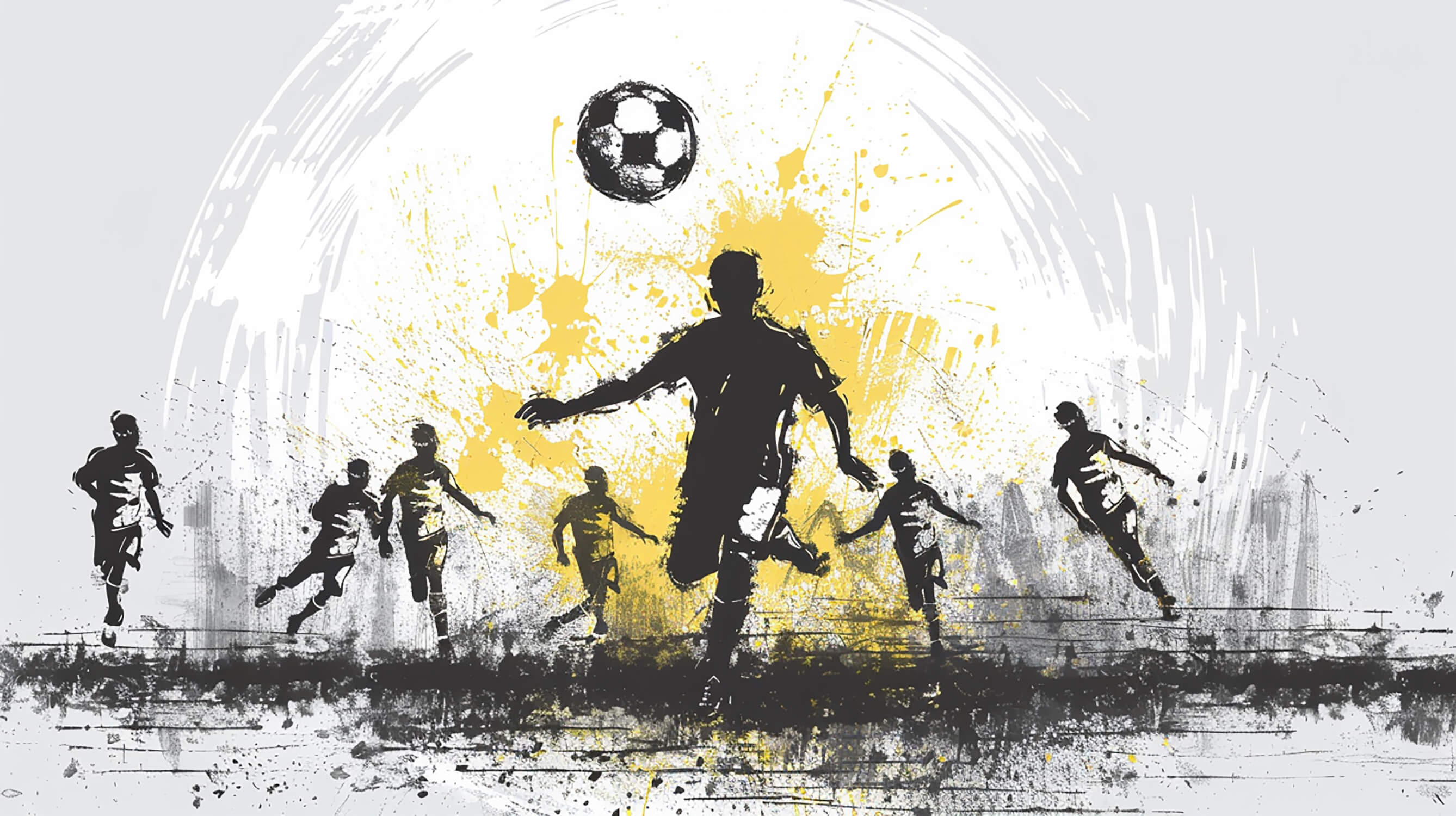 Cette fresque murale de football capture l'essence du beau jeu à travers une composition artistique saisissante. Des joueurs en silhouette dans des poses dynamiques se détachent sur un fond dramatique de taches dorées et de textures en niveaux de gris. La figure centrale, atteignant un élément de design papier peint de football, crée un point focal puissant tandis que les joueurs environnants ajoutent de la profondeur et du mouvement à la scène.