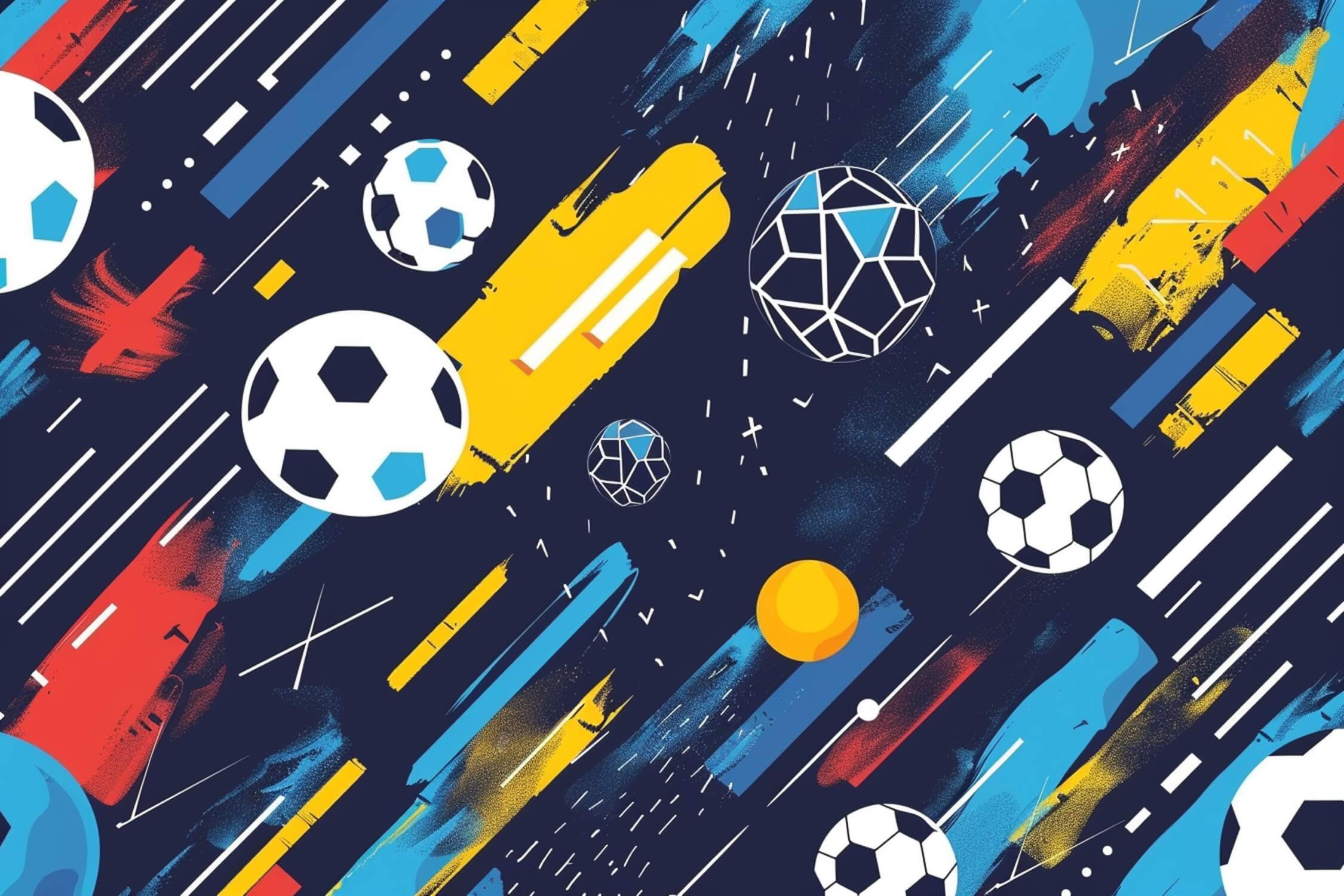 Ce papier peint à thème football présente une composition dynamique de ballons de football flottant sur un fond bleu marine profond, accompagnée d'éléments géométriques audacieux. Le design propose une palette de couleurs frappante avec des ballons blancs, des rayures jaunes vibrantes et des accents bleu électrique, créant une esthétique énergique et moderne. Des motifs géométriques et des éléments sportifs abstraits dansent à la surface, tandis que des coups de pinceau artistiques ajoutent du mouvement et une touche contemporaine.