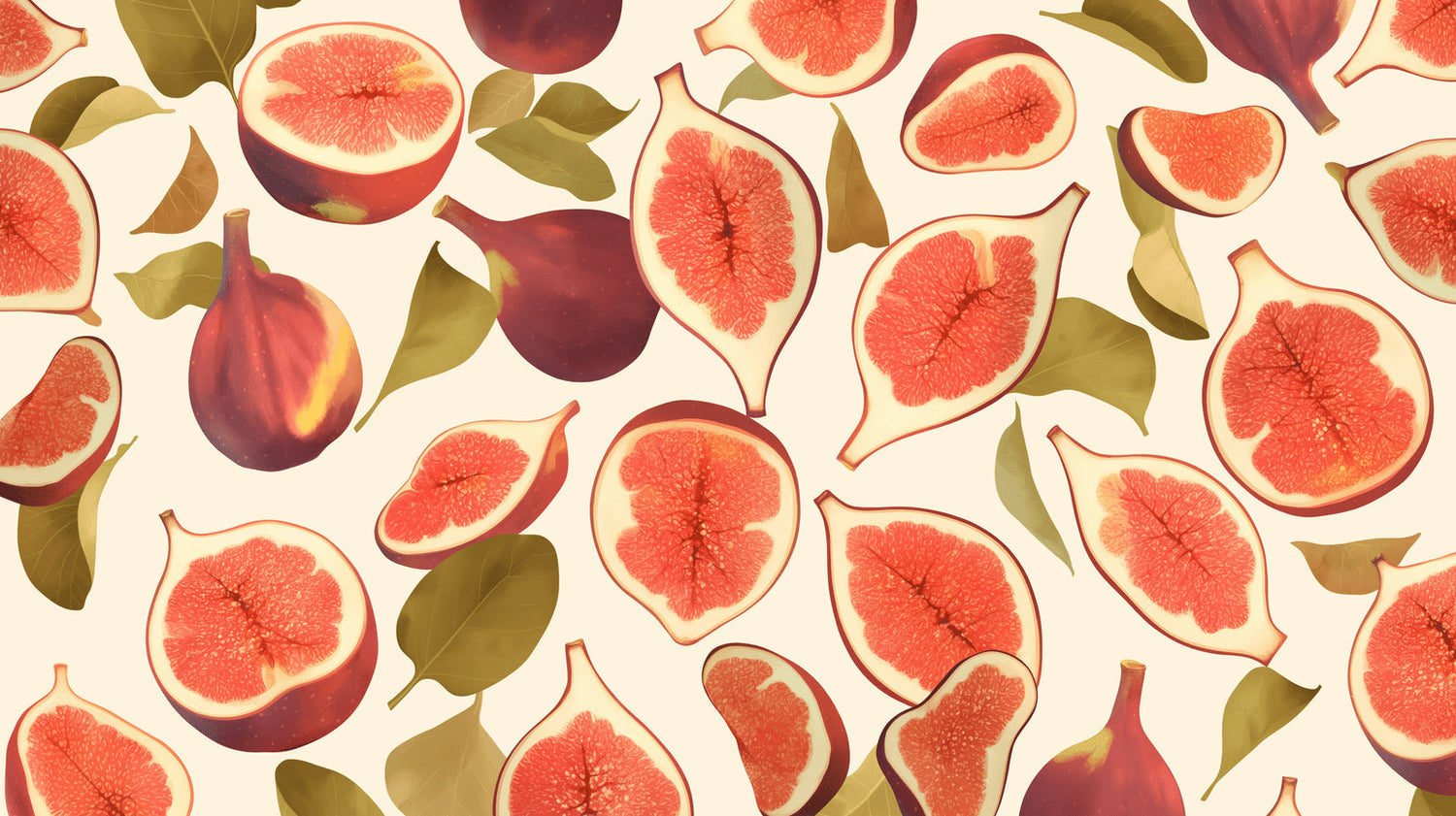 Ce papier peint figue fraîche présente une composition captivante de figues parfaitement tranchées sur un fond crème. Chaque fruit est rendu avec un détail saisissant, révélant la texture intérieure complexe et la chair rose corail, tandis que les peaux bordeaux profondes et les feuilles vert olive créent un contraste sophistiqué. Le motif papier peint fruits méditerranéens s'écoule dans une composition organique et dispersée qui apporte un rythme naturel et du mouvement au design.