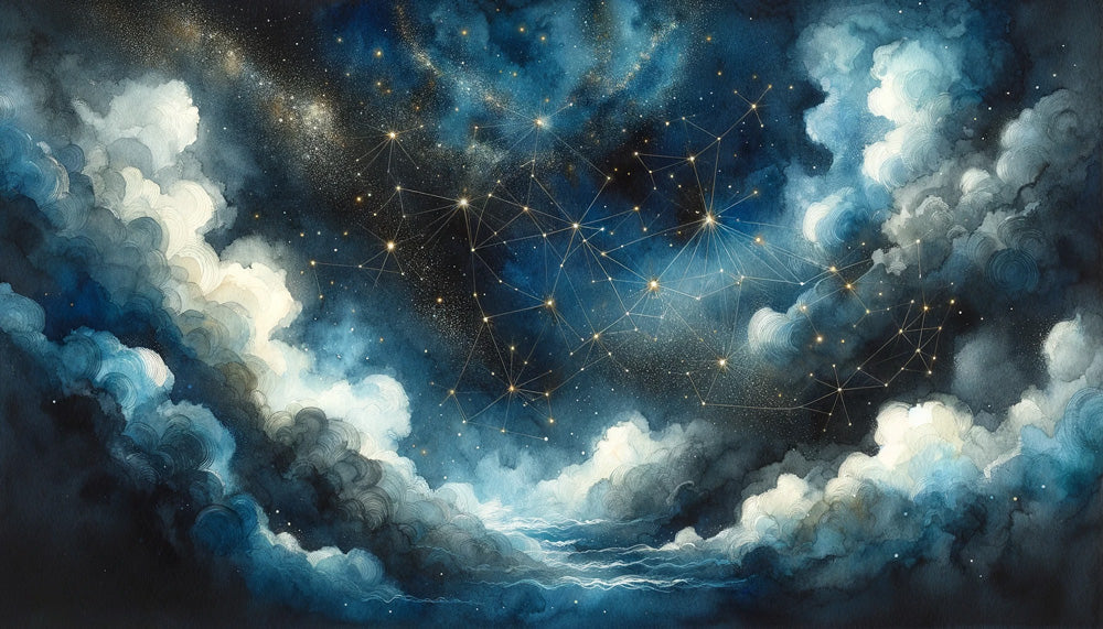 Ce papier peint constellation présente un paysage céleste fascinant où des formations d'étoiles dorées dansent à travers un ciel nocturne bleu profond. De délicates lignes géométriques relient des étoiles scintillantes, créant des motifs de galaxie complexes sur un fond de nuages éthérés. Le mélange artistique de bleus marine profonds et de formations nuageuses blanches douces crée une profondeur dimensionnelle, tandis que les connexions stellaires dorées ajoutent une touche de luminescence sophistiquée à ce panorama cosmique.
