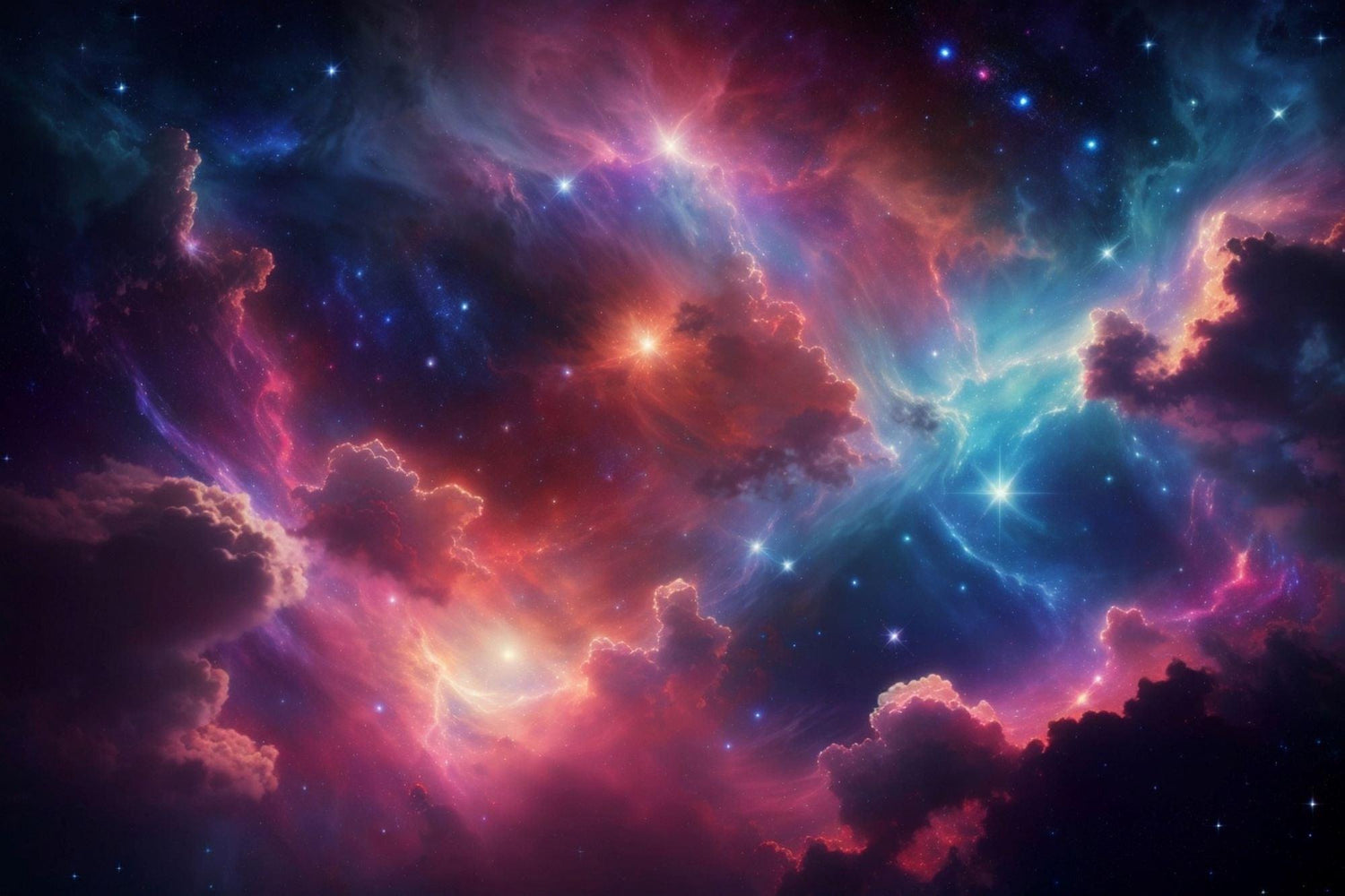 Ce papier peint nébuleuse cosmique capture la beauté brute de l'espace profond avec un détail à couper le souffle. Des nuages tourbillonnants de gaz célestes peignent le cosmos en riches nuances de turquoise, de violet profond et de cramoisi vibrant, tandis que des étoiles brillantes transpercent le voile cosmique. Cette fresque murale galaxie crée un spectacle astronomique immersif, où des amas d'étoiles lumineux et des formations éthérées semblables à des aurores dansent à travers l'étendue infinie.
