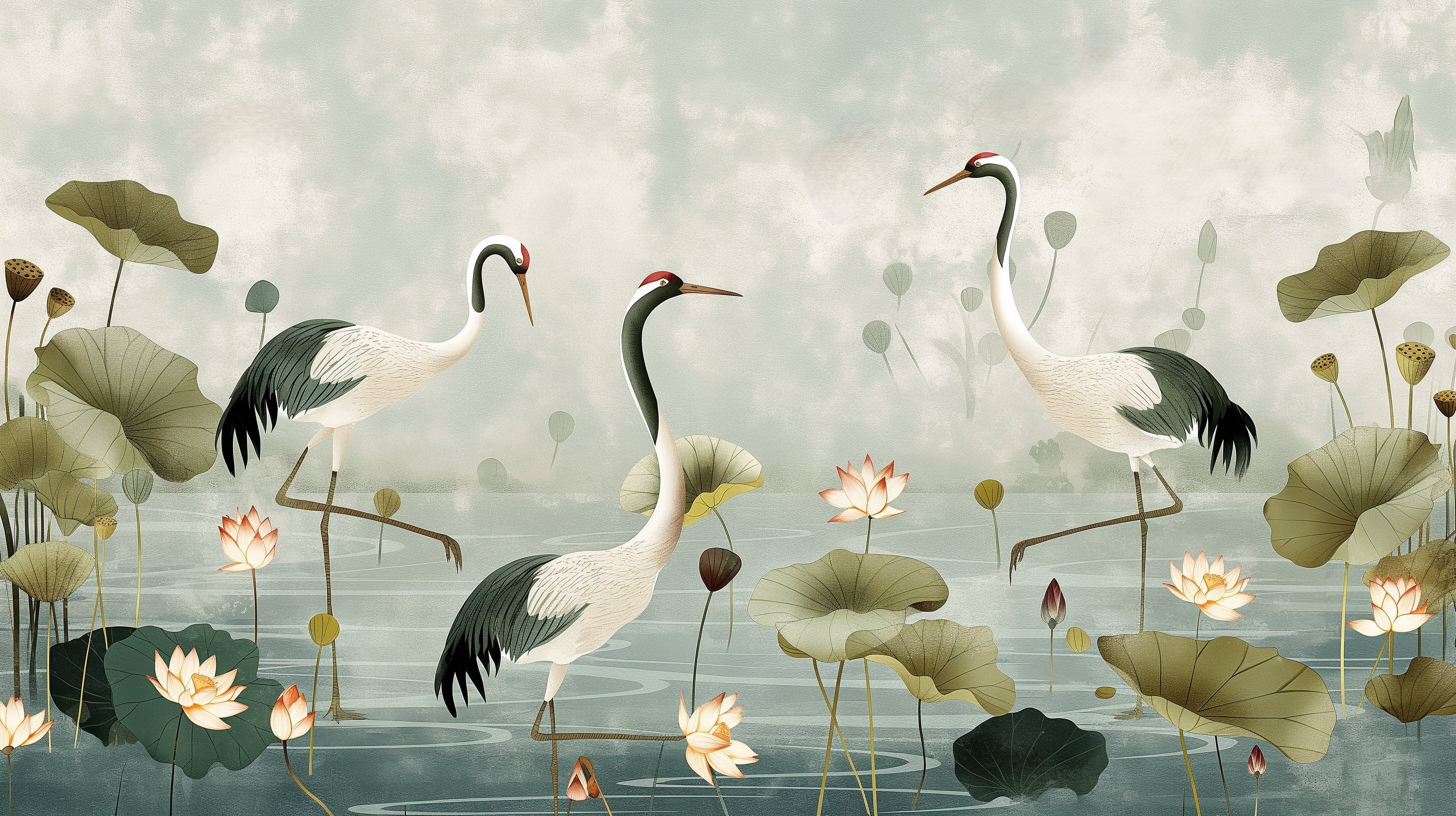 Papier Peint Mural Oiseaux | Grues Japonaises avec Fleurs de Lotus