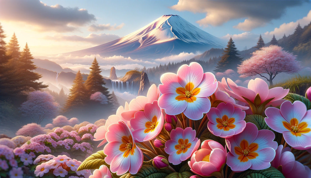 Ce papier peint paysage japonais crée un panorama enchanteur où le mont Fuji s'élève majestueusement au-dessus de vallées brumeuses et de cascades. Au premier plan, de délicates fleurs roses et bleues s'épanouissent avec une grâce éthérée, leurs pétales capturant la lumière douce et dorée de l'aube. La fresque murale du mont Fuji présente un mélange harmonieux de forêts de pins, de falaises rocheuses et de nuages doux, tous peints dans des bleus sereins et des violets rêveurs.