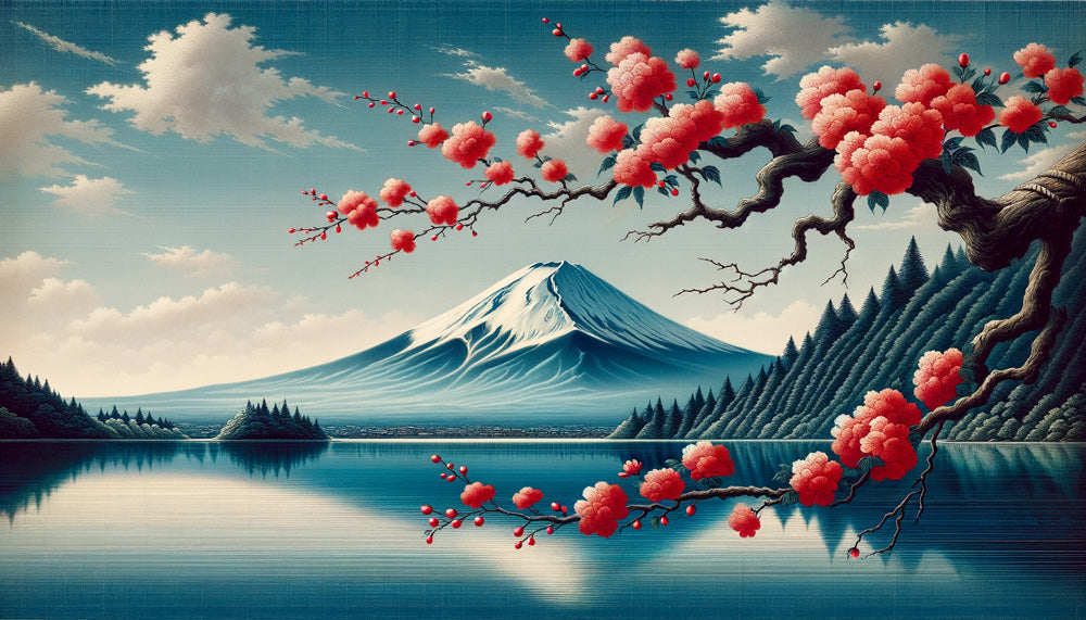Ce papier peint paysage japonais capture la splendeur emblématique du mont Fuji dans une vue panoramique à couper le souffle. Le sommet enneigé s'élève majestueusement contre un ciel turquoise parsemé de nuages doux, tandis que les branches de fleurs de cerisier corail vif encadrent la scène avec leurs délicates floraisons. Le lac tranquille reflète la grandeur de la montagne, créant une composition parfaitement équilibrée renforcée par les forêts de pins vert foncé le long du rivage.